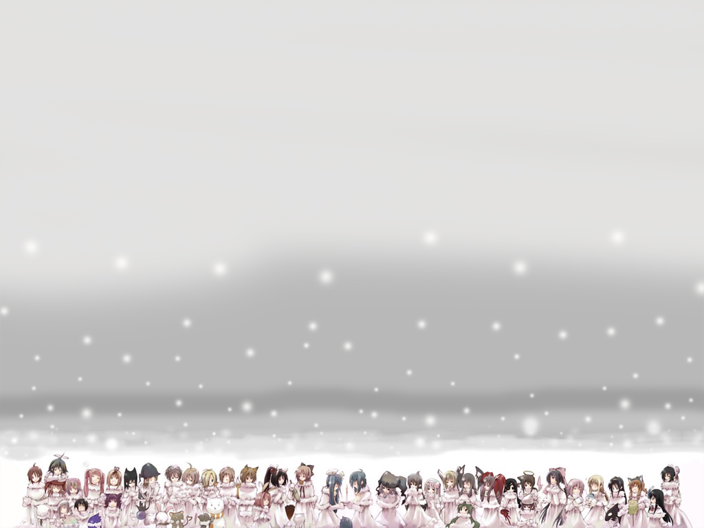 Description: A group of people standing in the snow together with a sky background and snow falling on them and snowflakes.
