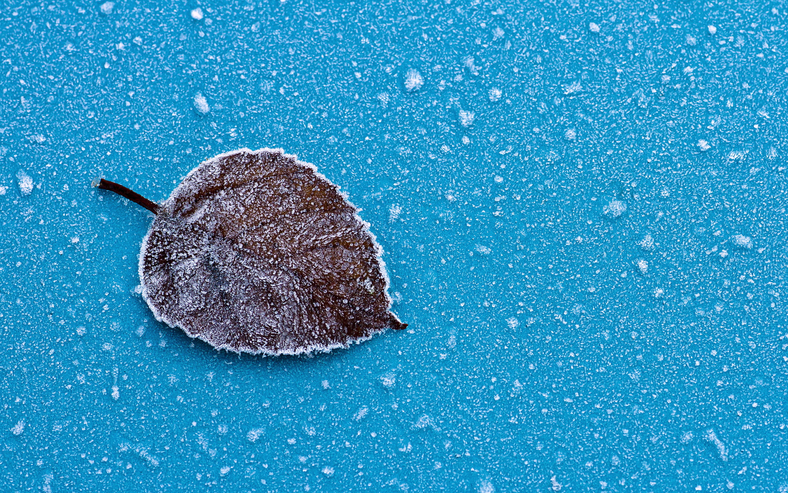 Description: A leaf is covered in snow on a blue surface with drops of water on it and a few drops of snow on the ground.