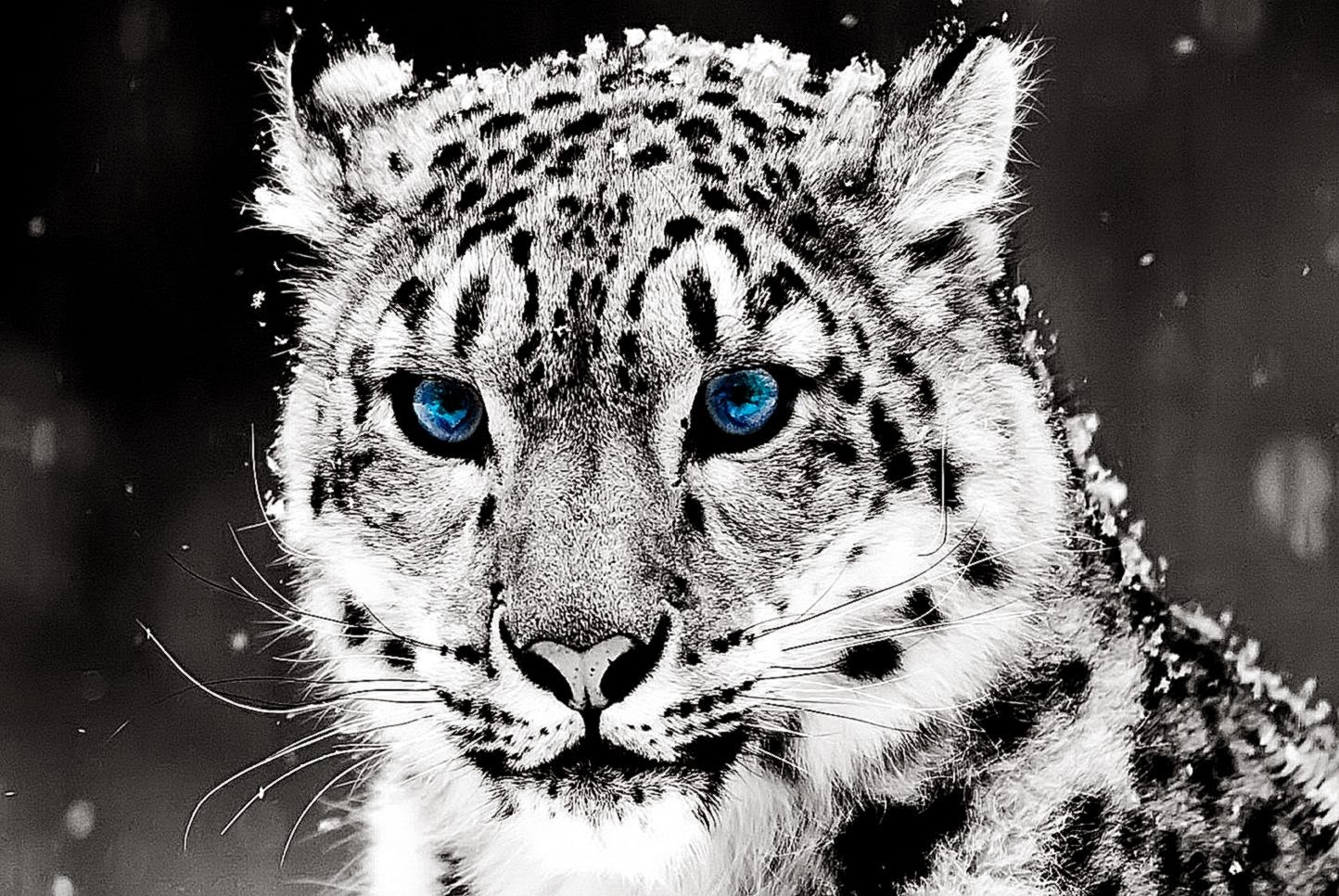 Description: A snow leopard with blue eyes looking at the camera in the snow with snow falling on it's face.