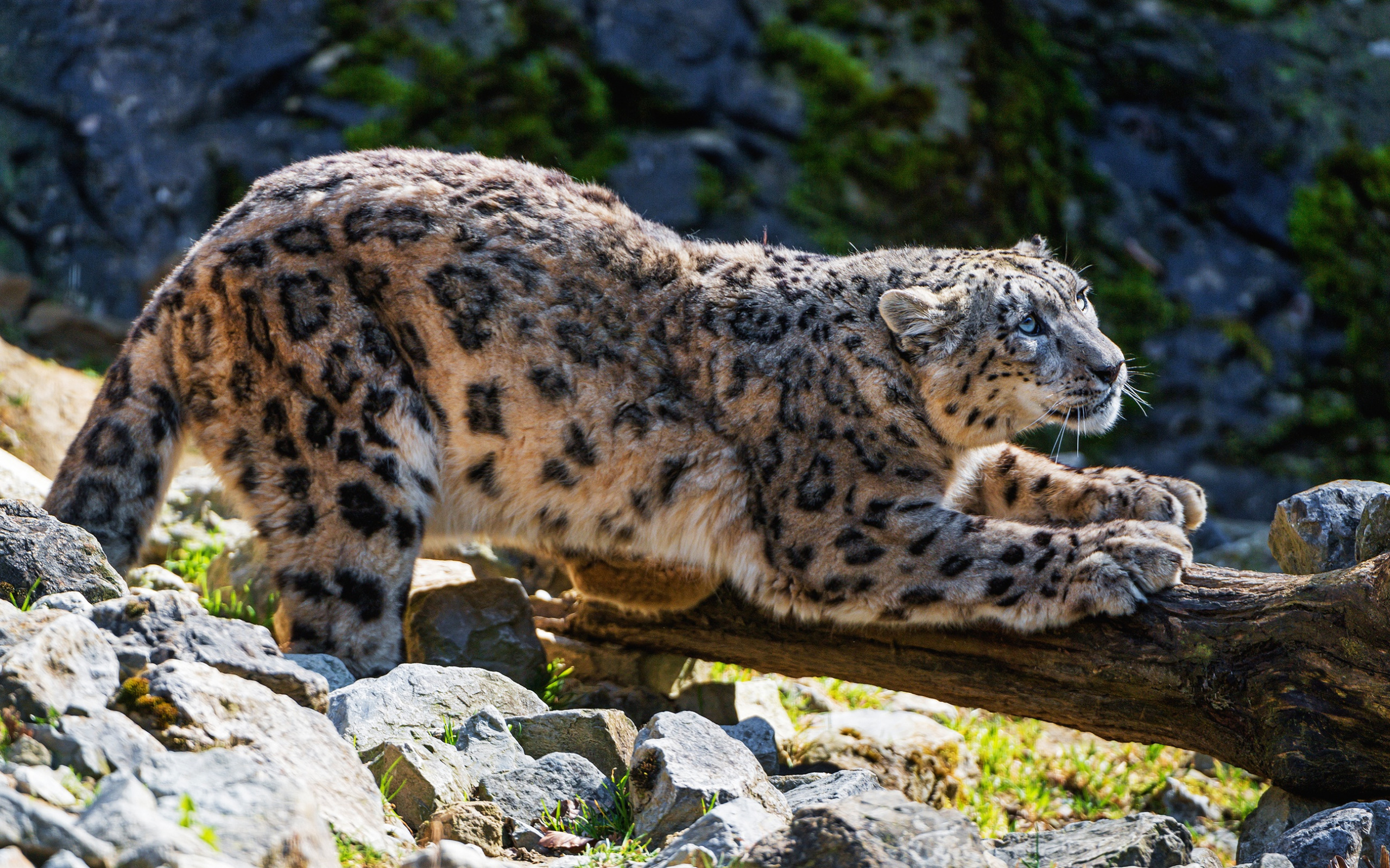 Description: A snow leopard is walking on a log in the grass and rocks of a mountain side area with a rock wall in the background.