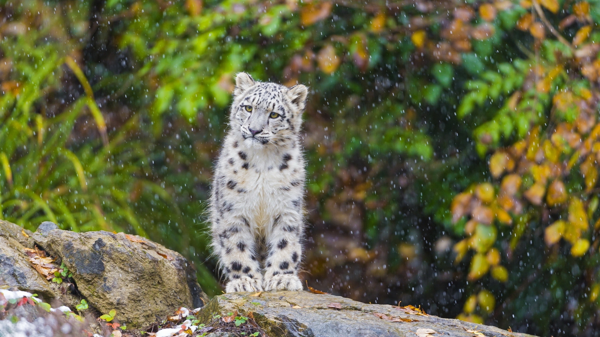 Description: A snow leopard sitting on a rock in the rain with trees in the background and falling snow on the ground.