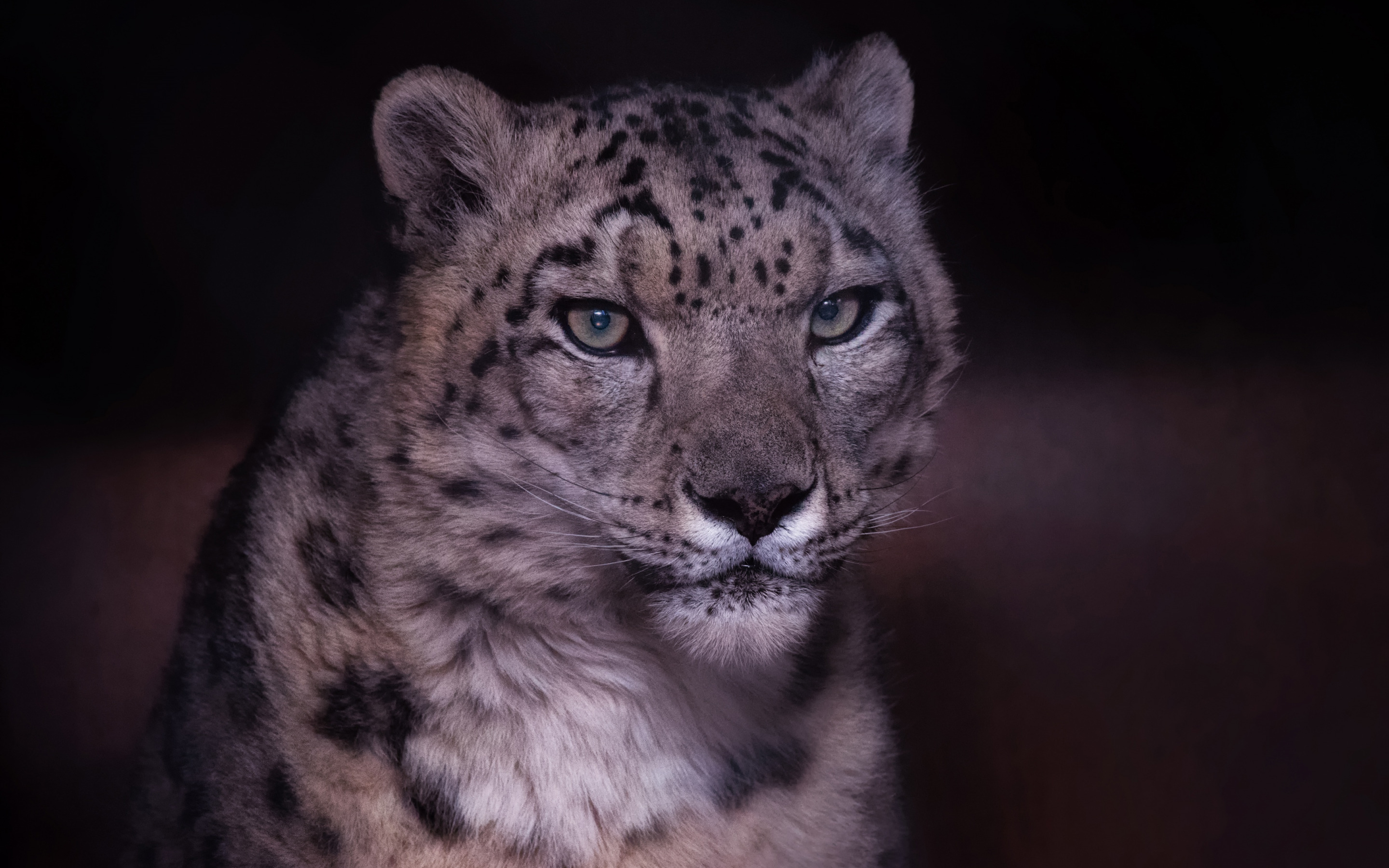 Description: A snow leopard is sitting down and staring at the camera with a black background and a black background behind it.