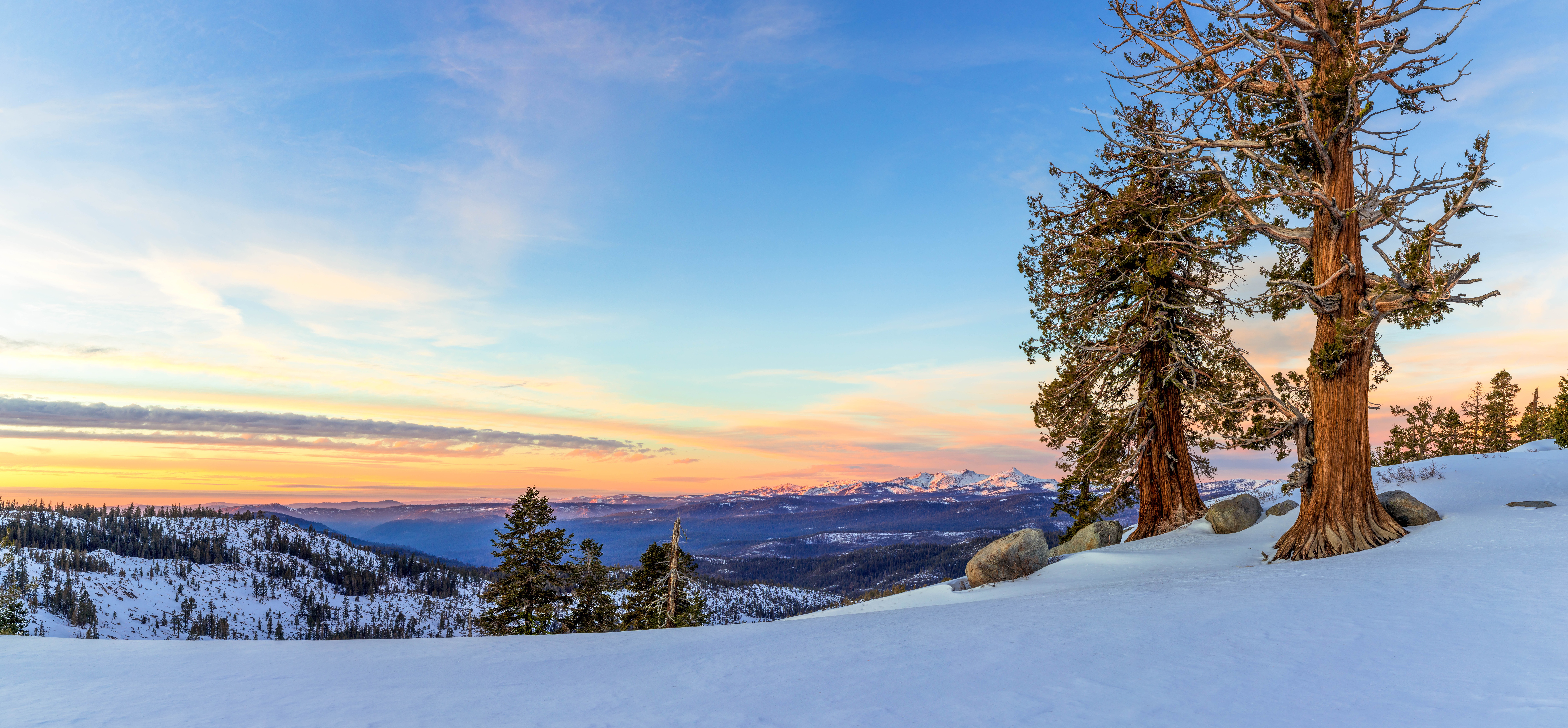 Description: A snow covered mountain with a tree in the foreground and a sunset in the background with clouds in the sky.