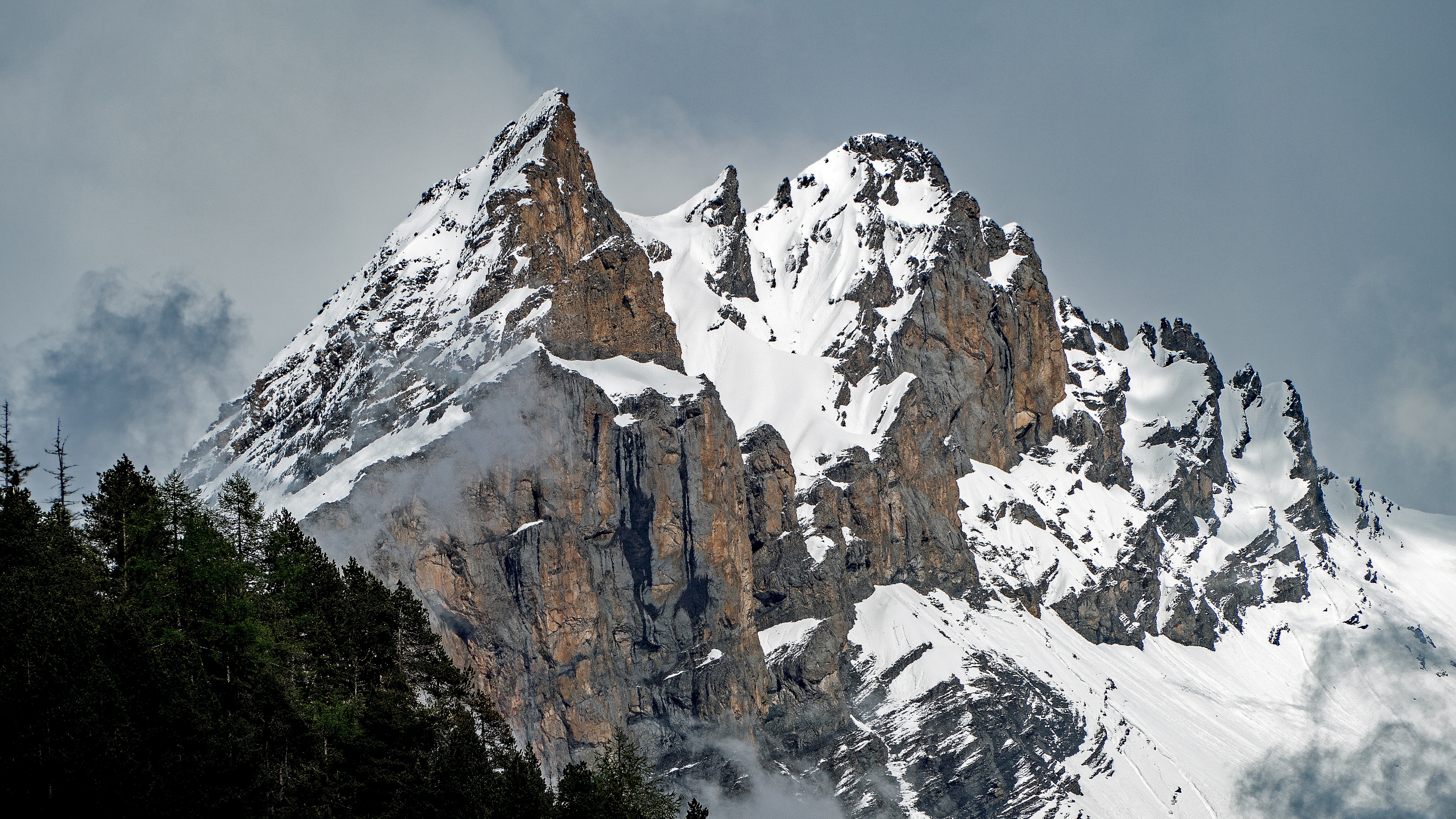 Description: A snow covered mountain with trees on the side of it and clouds in the sky above it and below it.