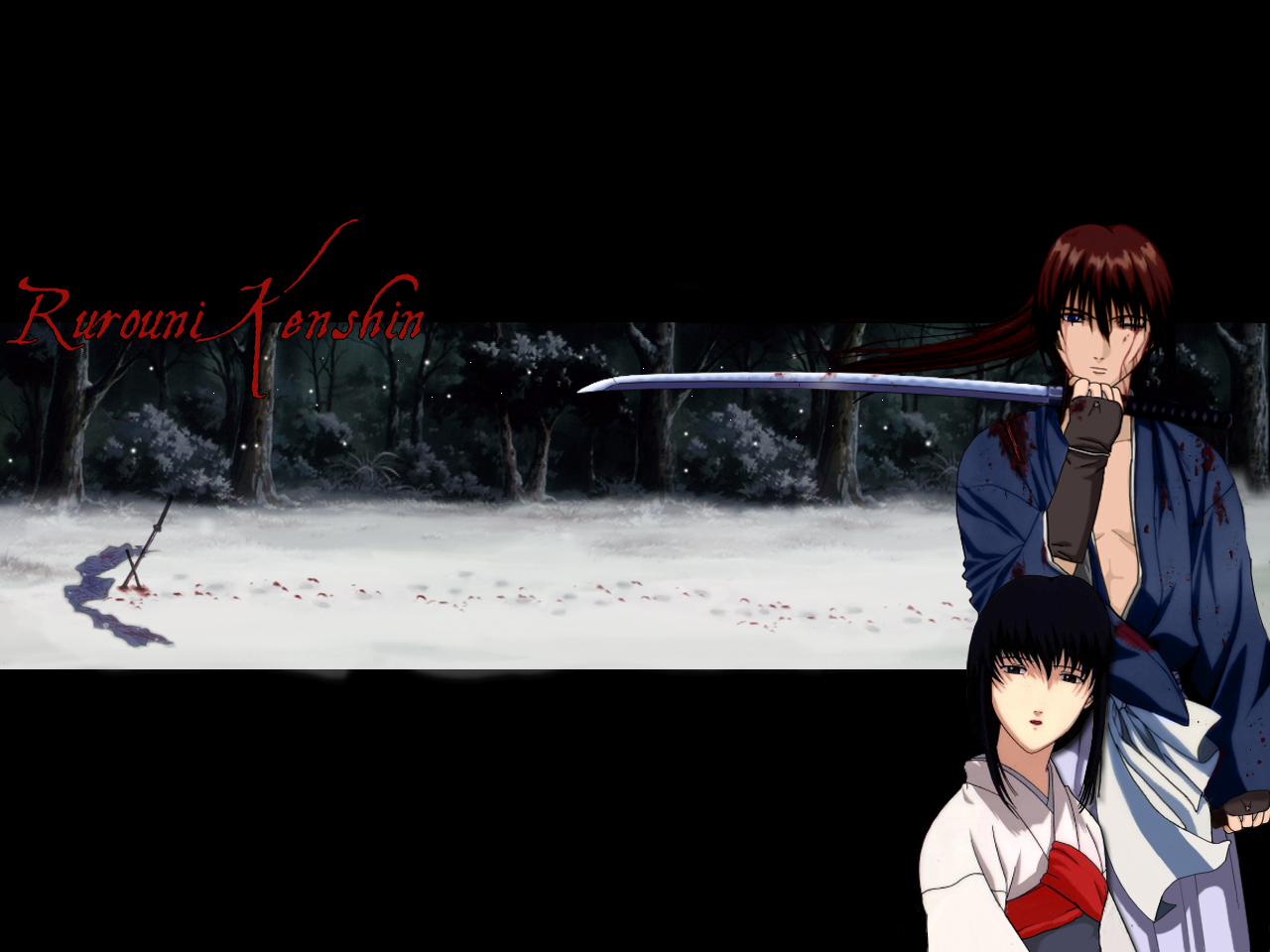 Description: Two anime characters standing in the snow with swords in their hands and a black background with a red and white text that reads.