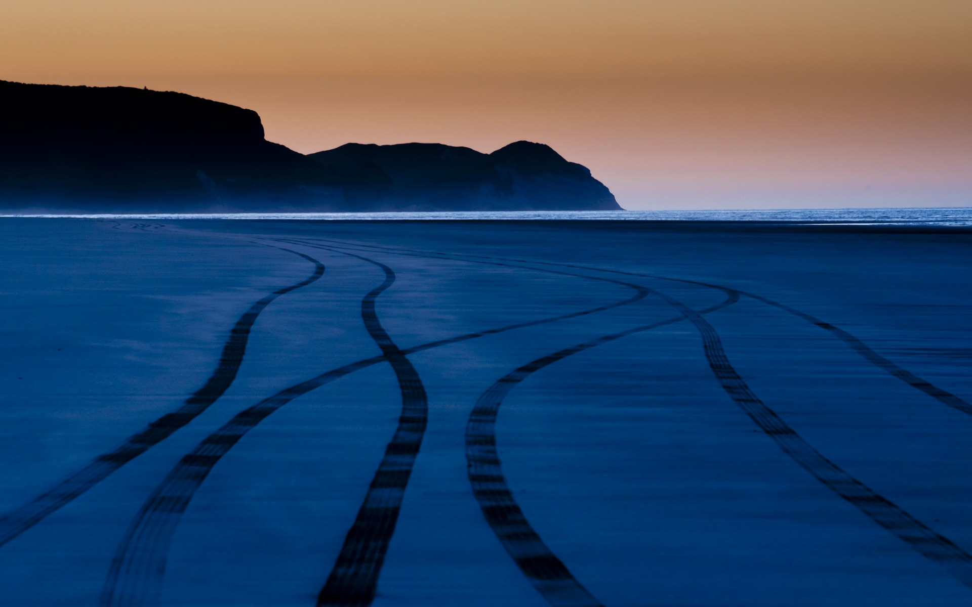 Description: A long line of tracks in the snow near a mountain range at sunset with a distant rock outcropping.