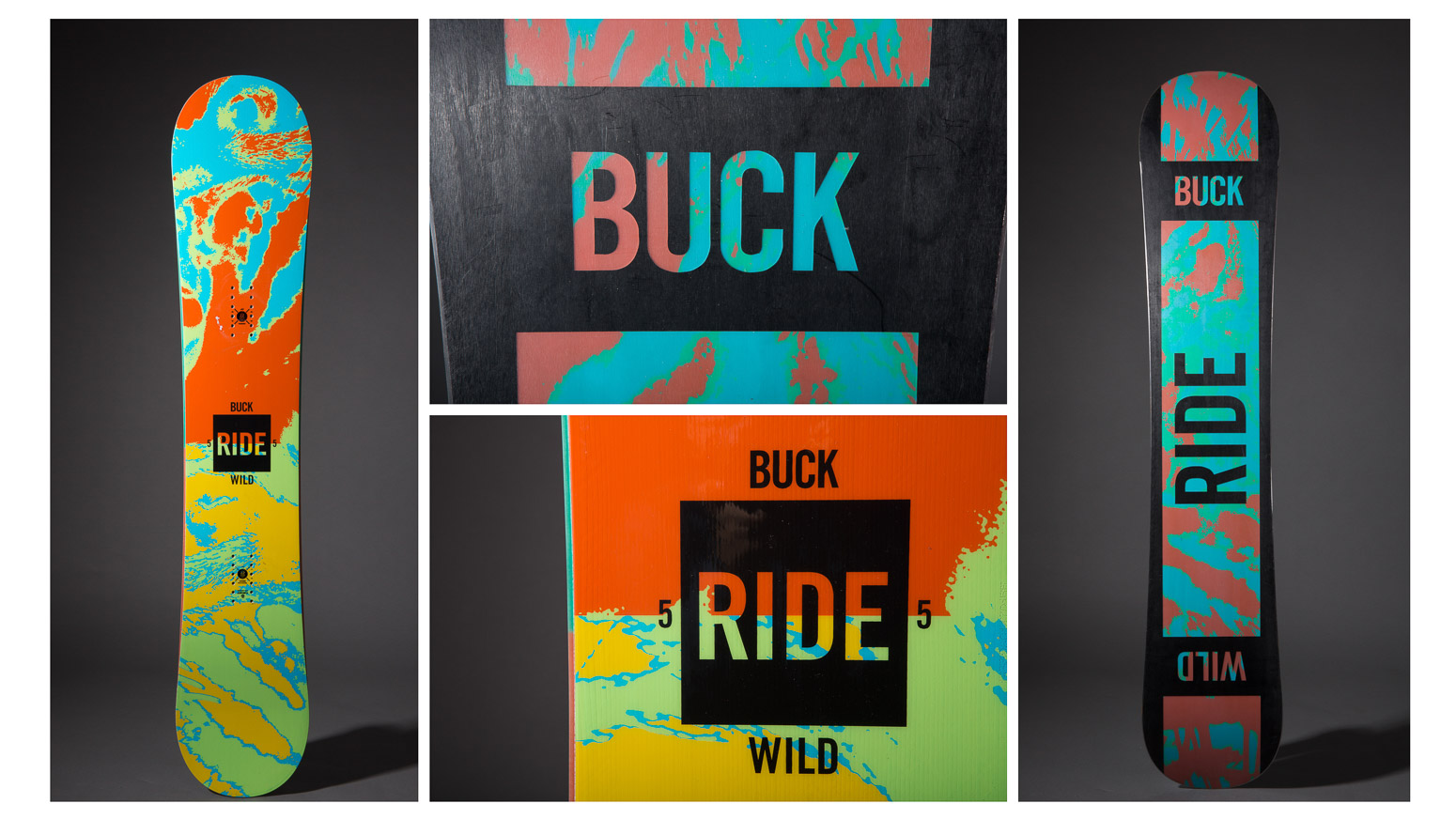 Description: A snowboard with a colorful design on it and a black background with a white border and a red.