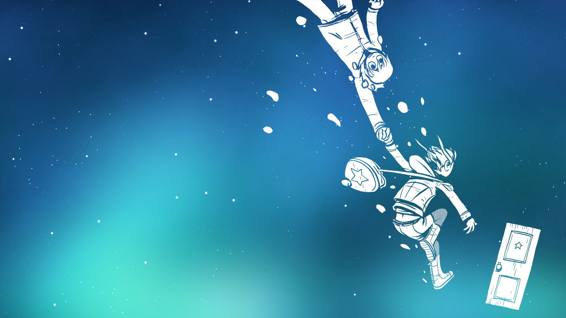 Description: A person on a snowboard in the air above the ground with a sky background and a blue sky.