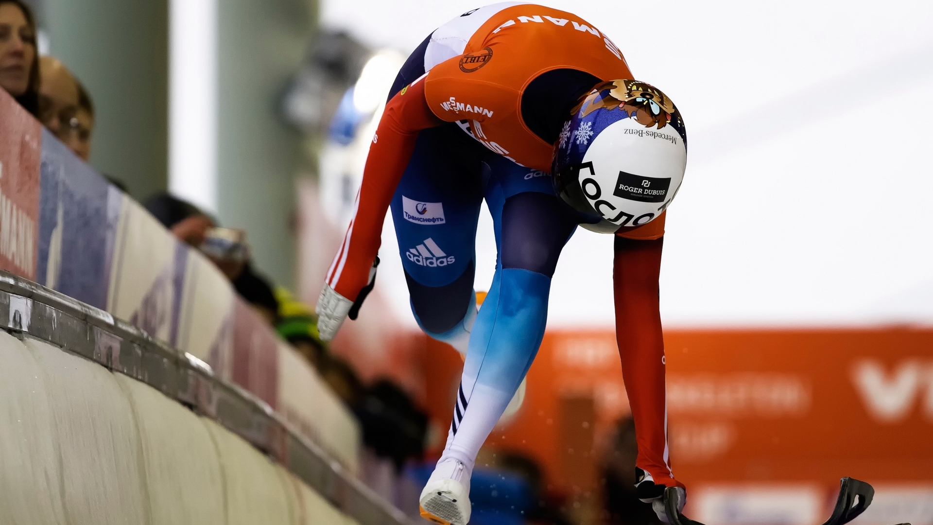 Description: A man riding a snowboard down a snow covered slope in a competition ring with spectators watching from the stands.