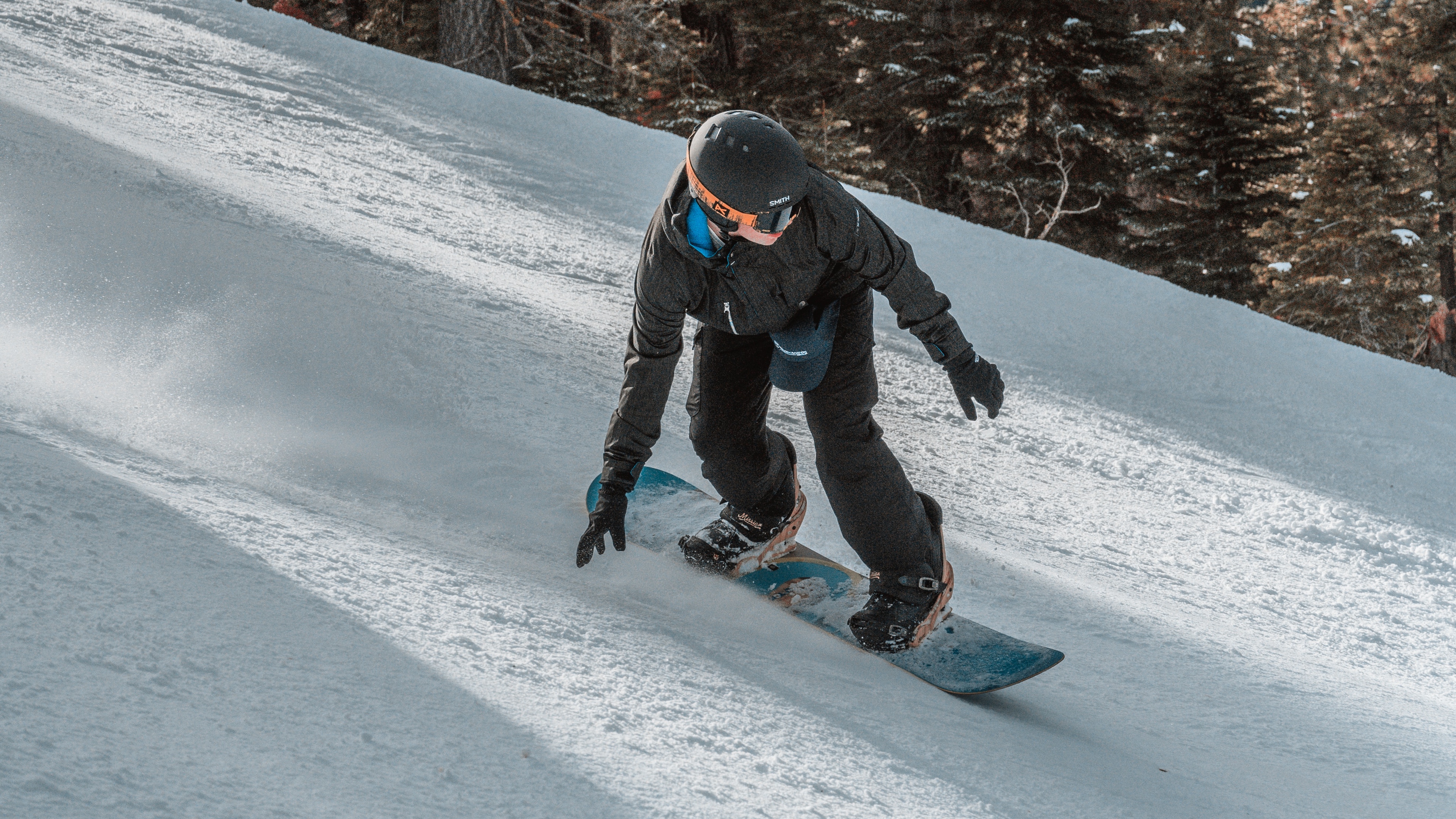 Description: A person riding a snowboard down a snow covered slope in the snow with trees in the background and a person in the background.
