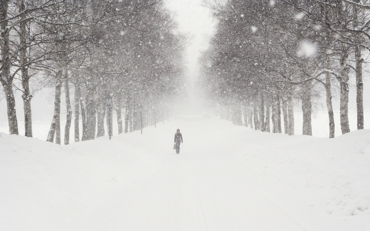 Description: A person riding a snowboard down a snow covered slope next to trees and a forest of snow covered trees.