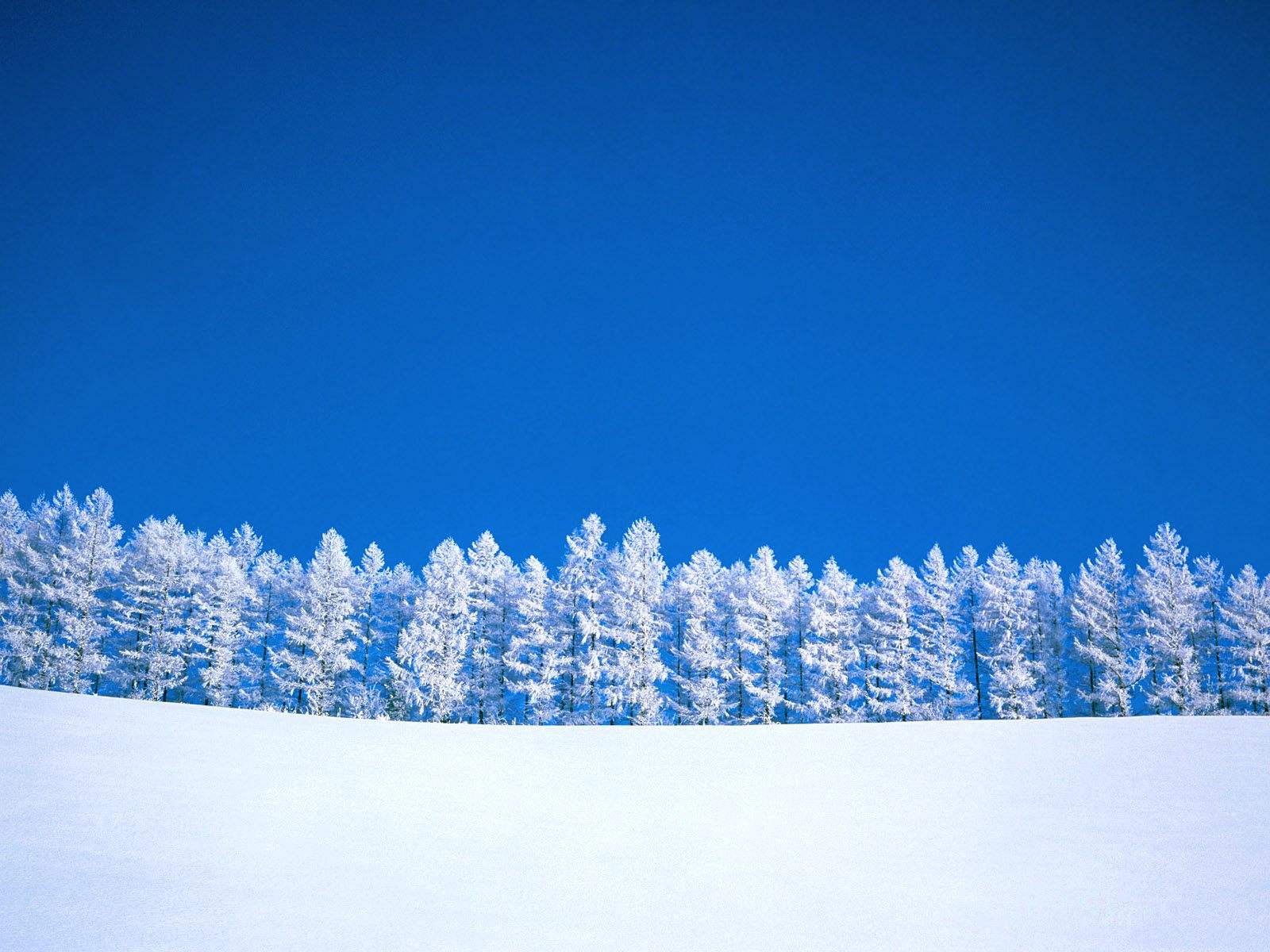 Description: A snowboarder is going down a snowy hill with trees in the background and a blue sky above.