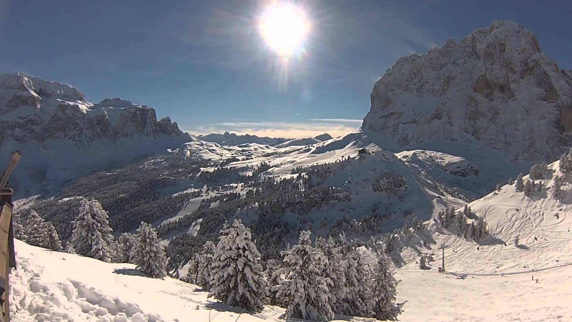 Description: A person on a snowboard on a snowy mountain slope with a sun in the background and a mountain range in the foreground.