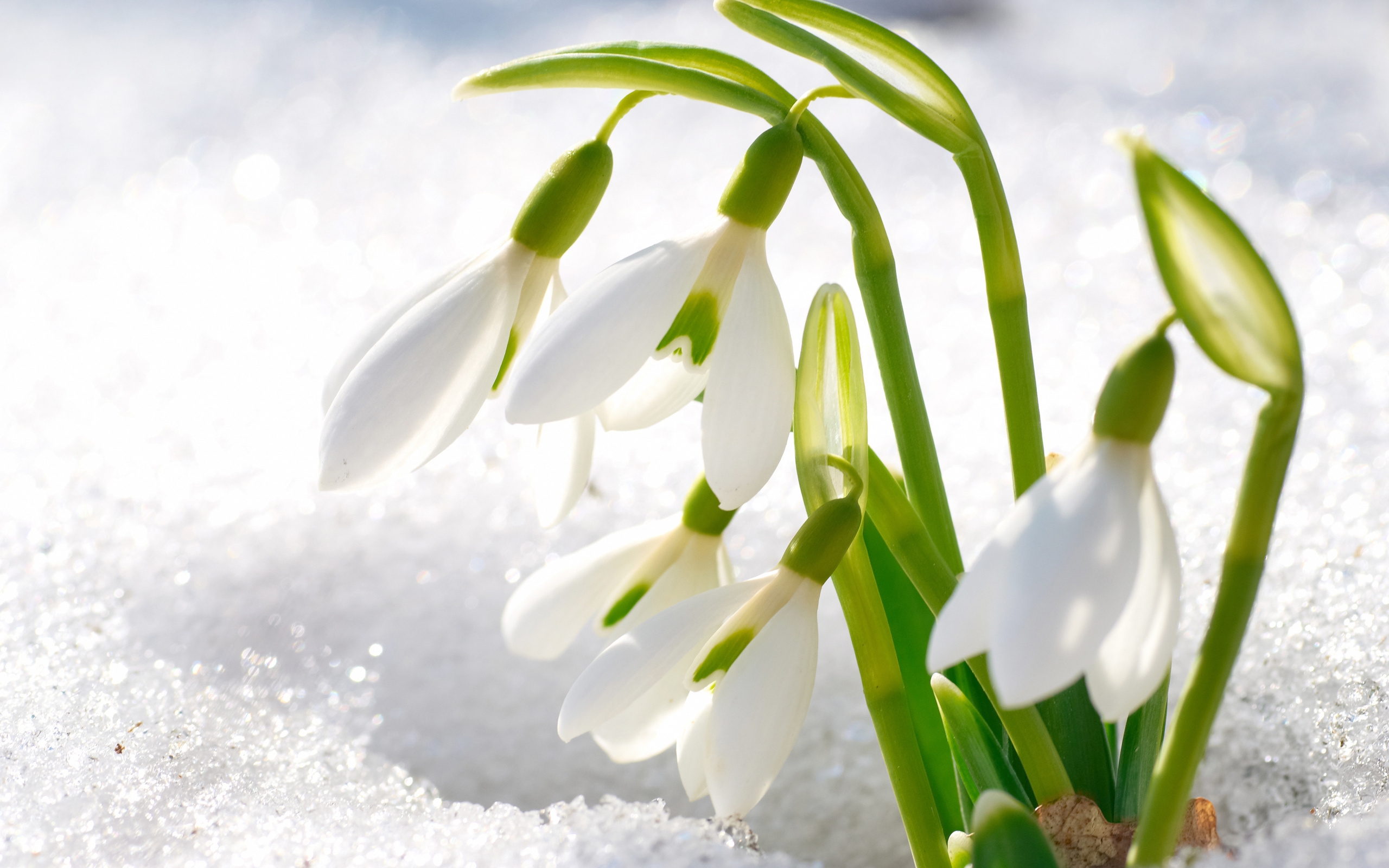Description: A group of snowdrops in the snow with snow flakes on them and snow flakes on the ground.
