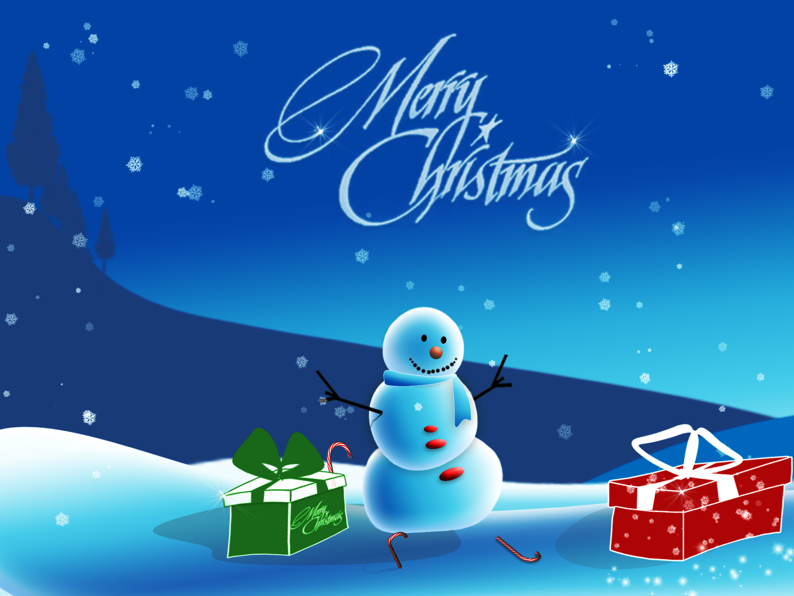 Description: A snowman is standing in the snow with a gift box in front of him and a merry christmas message.