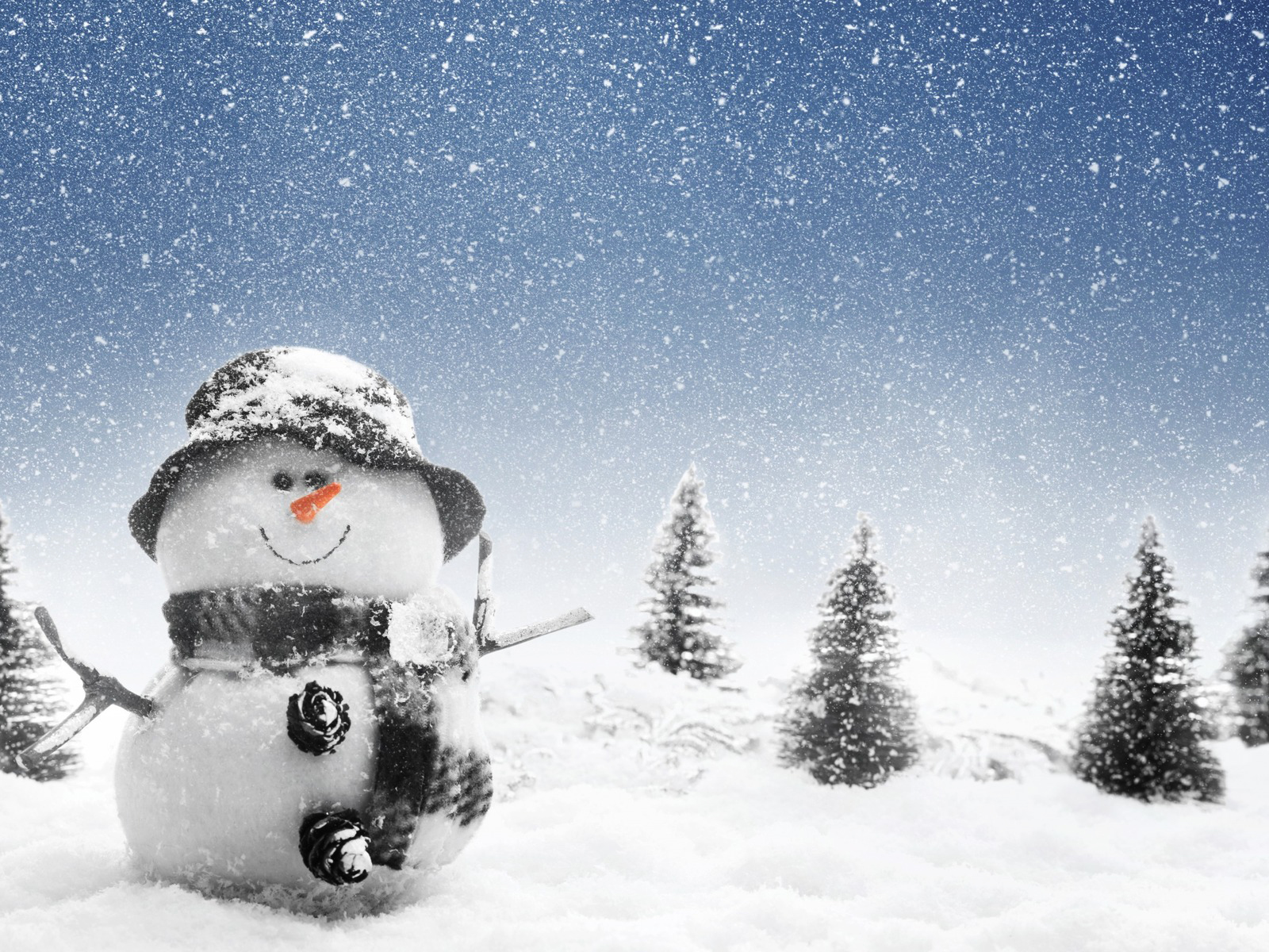 Description: A snowman is standing in the snow with trees in the background and a blue sky with a few clouds.