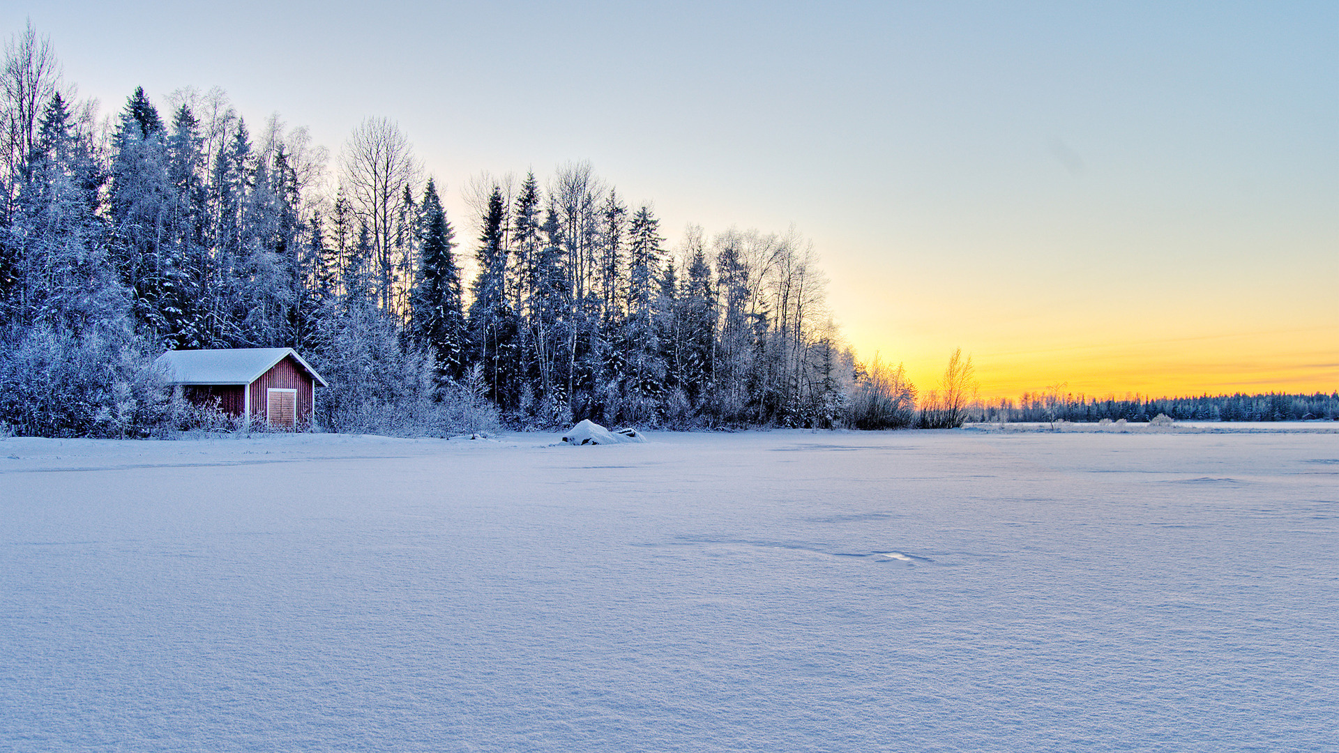 Description: A snowy field with a small cabin in the distance and trees in the background at sunset or dawn with a few clouds.