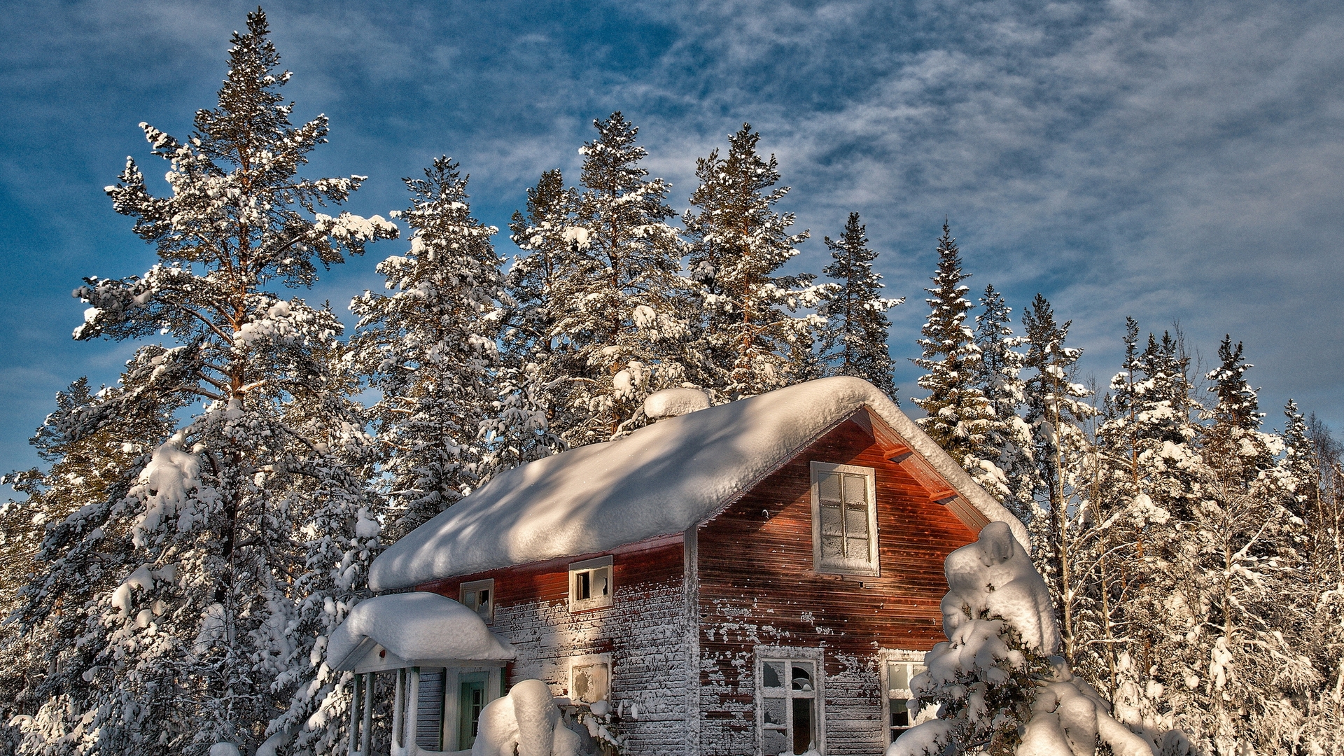 Description: A cabin in the woods covered in snow and trees covered in snow with a blue sky and clouds above.
