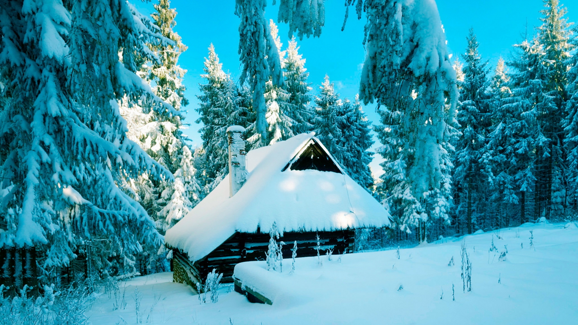 Description: A cabin in the woods covered in snow and surrounded by trees and snow covered ground with snow on the roof.