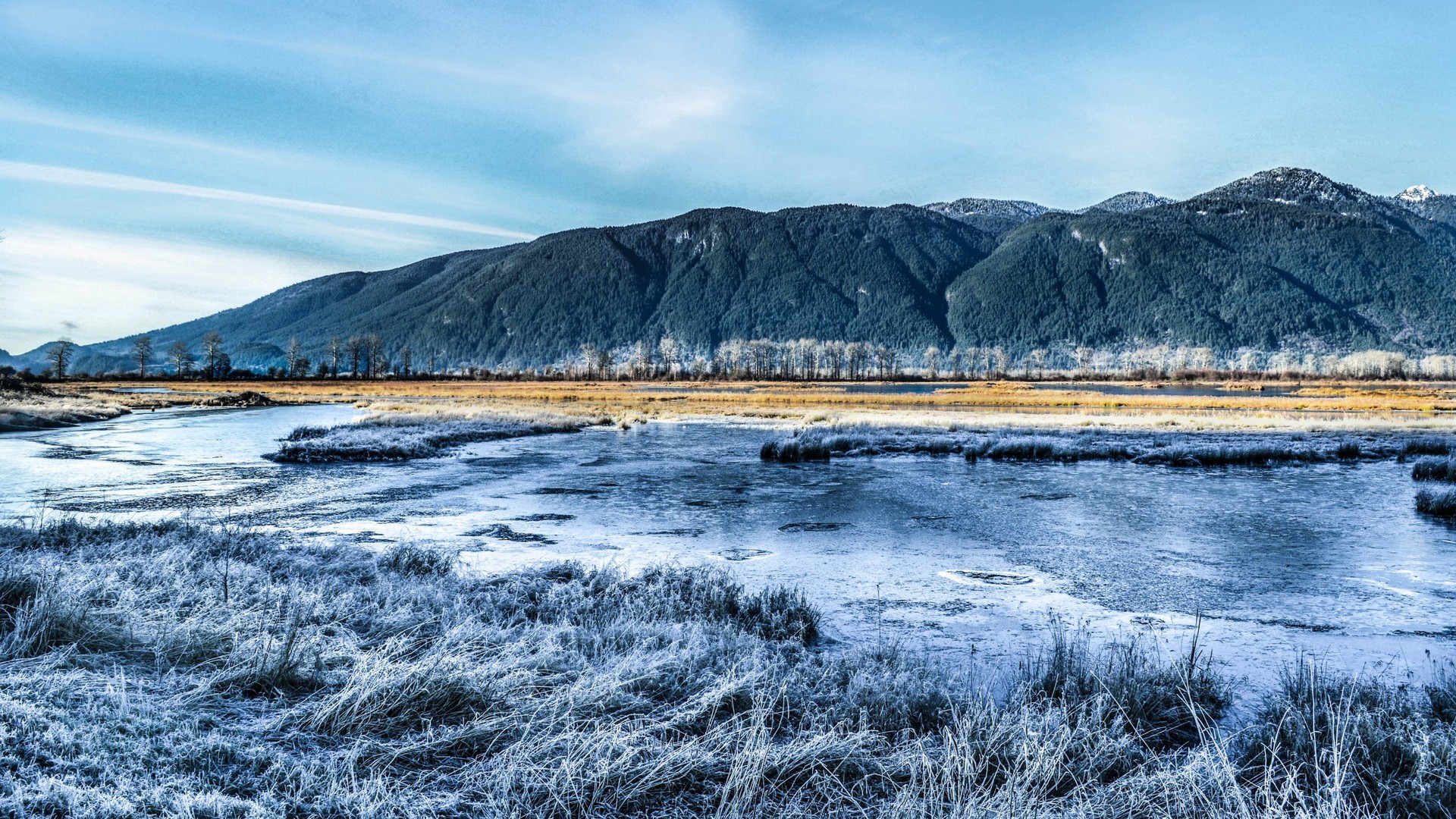 Description: A snowy field with a mountain in the background and a river running through it with snow on the ground.