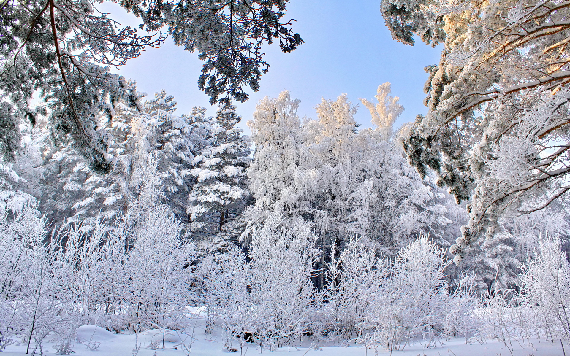 Description: A snowy forest with trees and a bench in the snow on a sunny day with a blue sky in the background.