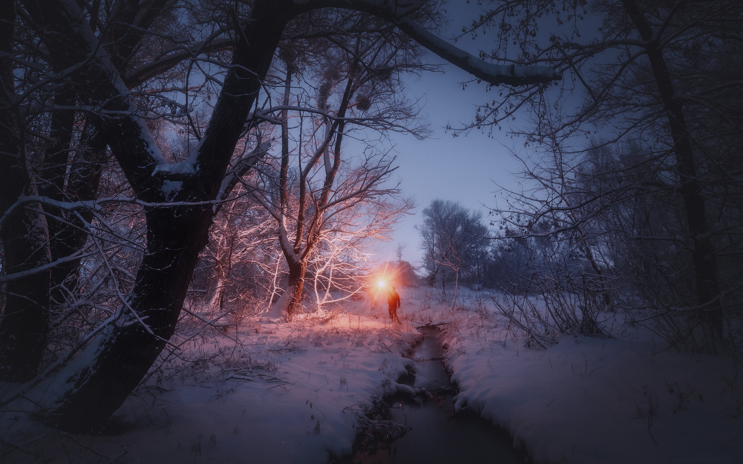 Description: A person standing in the snow near a forest at night with a flashlight in their hand and a trail in the background.