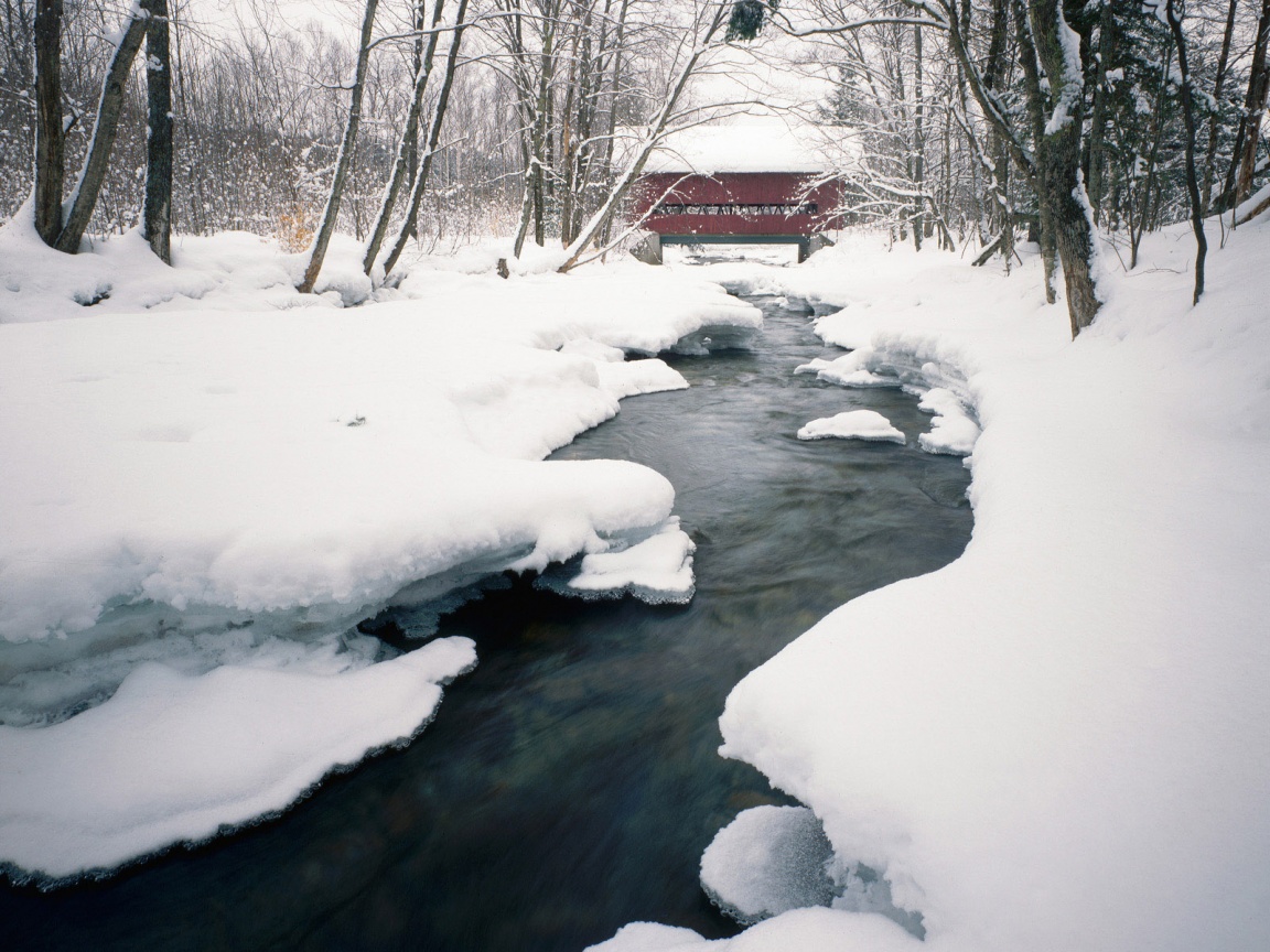 Description: A stream running through a snow covered forest next to a red covered bridge and a red covered bridge in the distance.