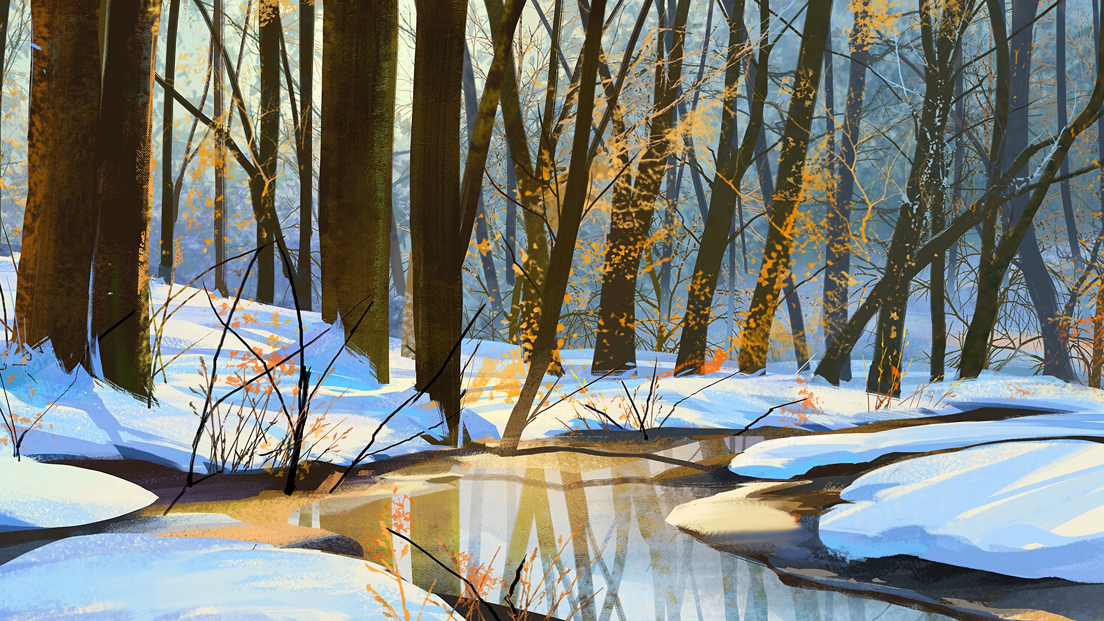 Description: A painting of a stream in a snowy forest with trees and snow on the ground and a few leaves on the ground.