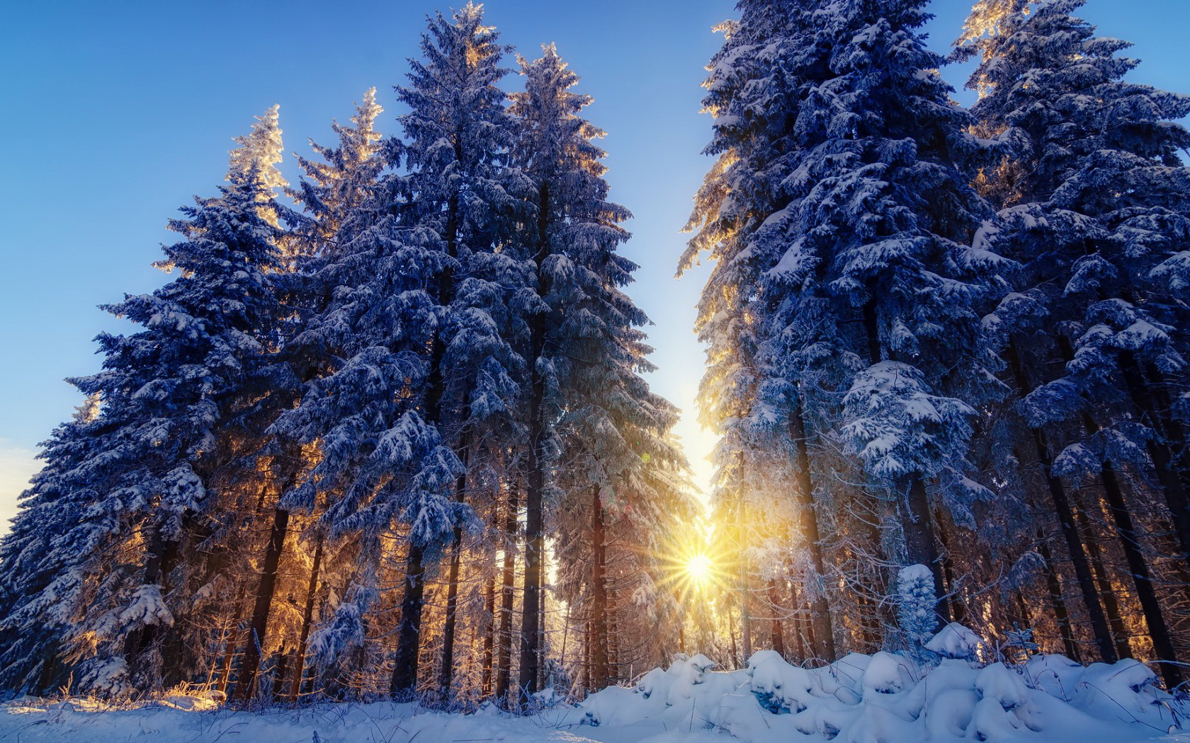 Description: A forest with snow covered trees and the sun shining through the trees in the distance.