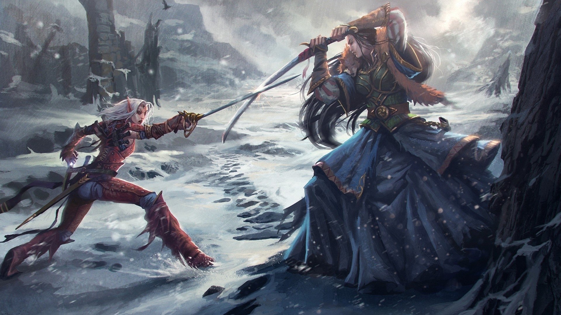 Description: Two people in a snowy forest with two swords in their hands and one holding a sword in her hand.