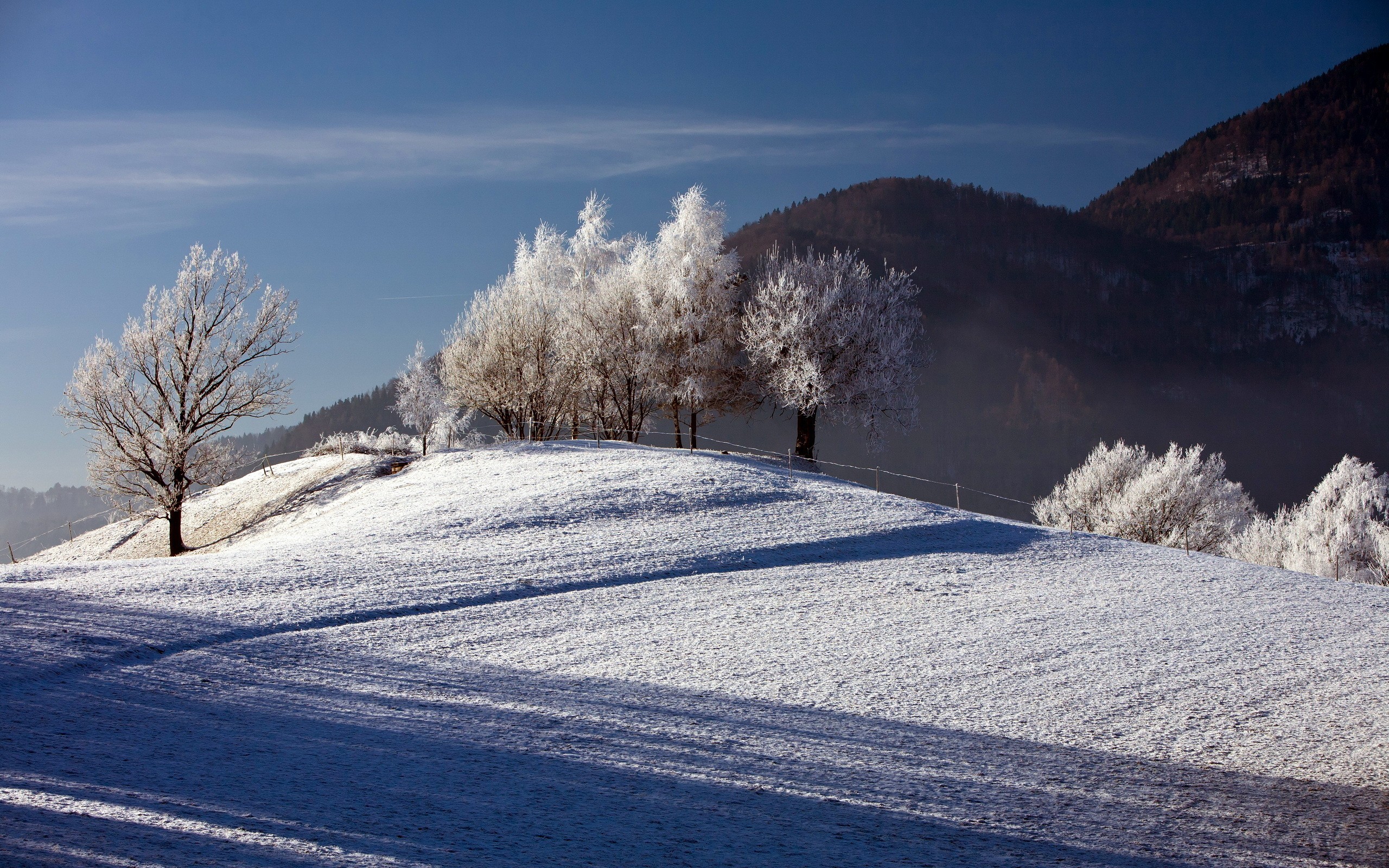 Description: A snowy hill with trees and a hill in the background with a blue sky and clouds in the distance.