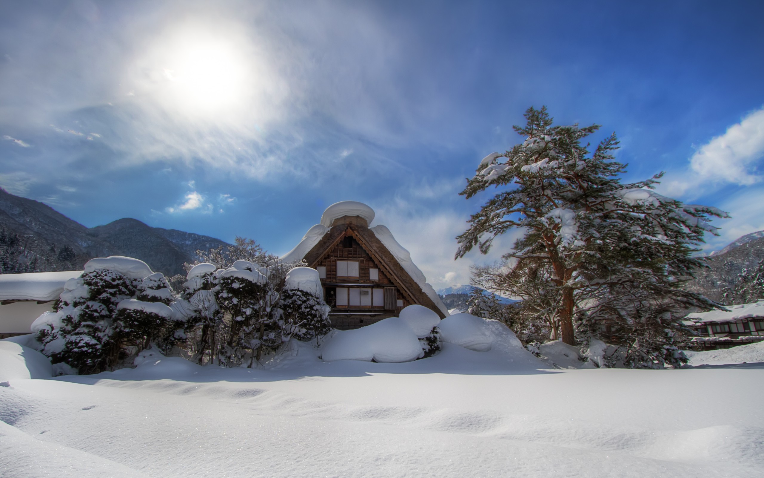 Description: A house in the snow with a sky background and clouds above it and trees in the foreground and a sun in the background.