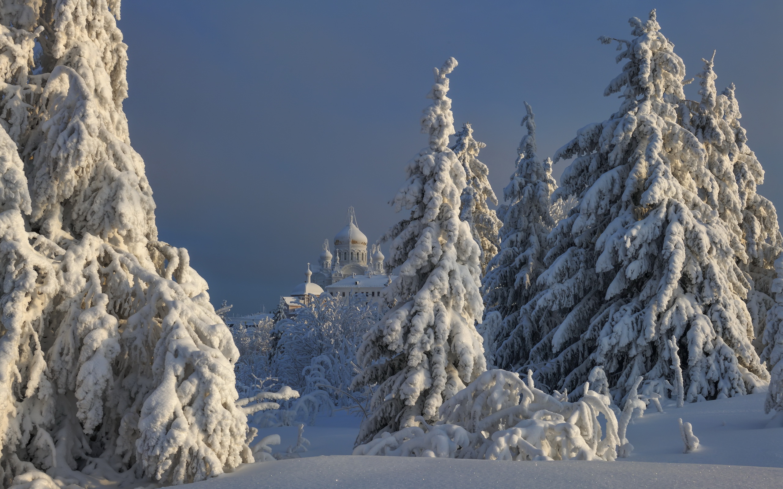 Description: A snowy landscape with trees and a castle in the background with a blue sky in the background and a few clouds in the sky.