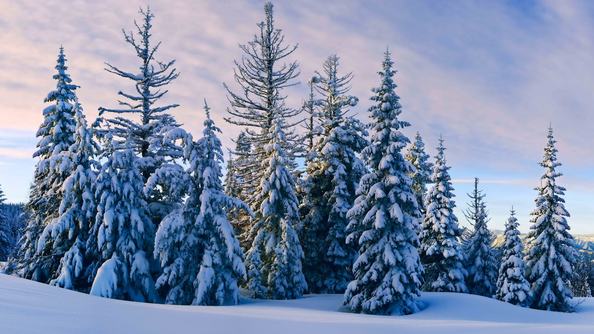 Description: A snowy landscape with trees and a blue sky in the background with clouds in the sky and a few snow covered trees.