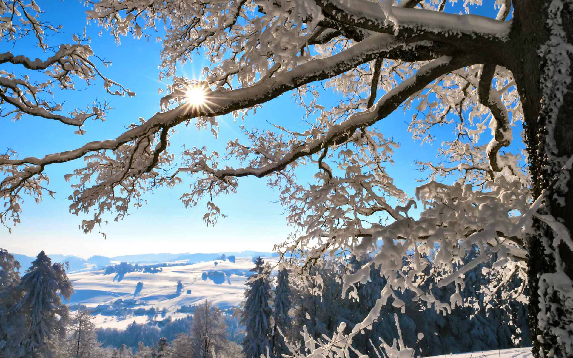 Description: A snowy landscape with trees and a bright sun in the background.