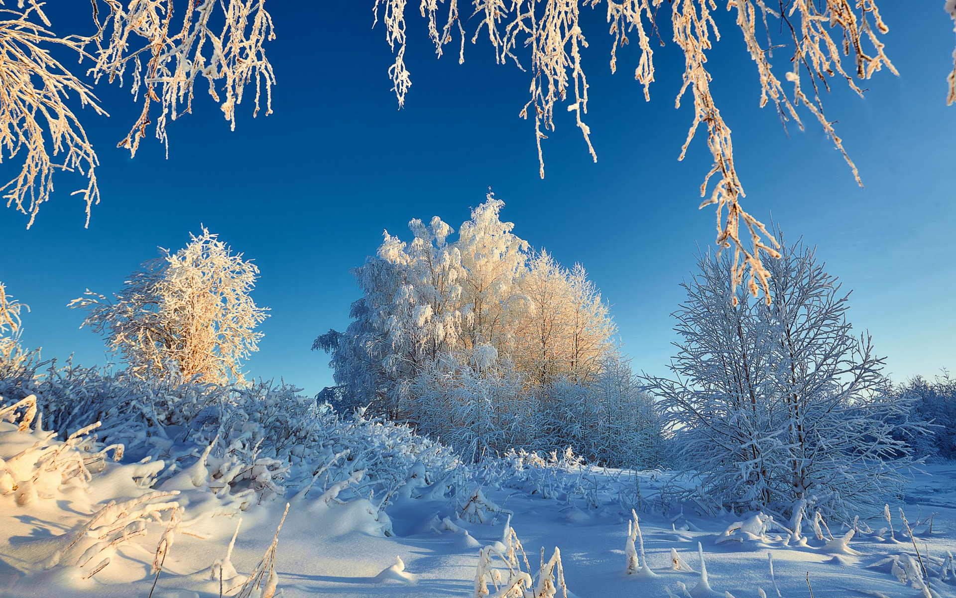 Description: A snowy landscape with trees and bushes covered in snow and ice on a sunny day with blue sky in the background.