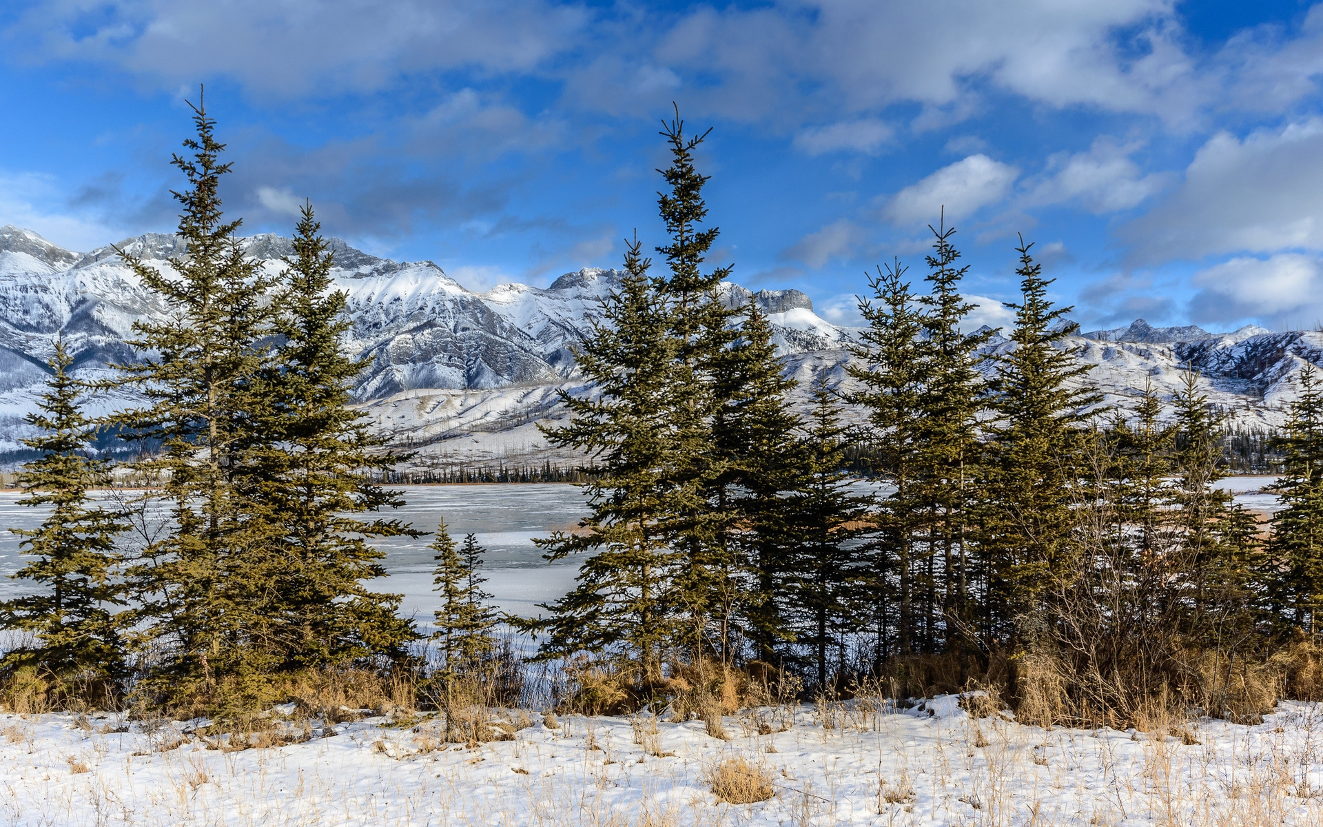 Description: A snowy landscape with trees and mountains in the background and a lake in the foreground with snow on the ground.