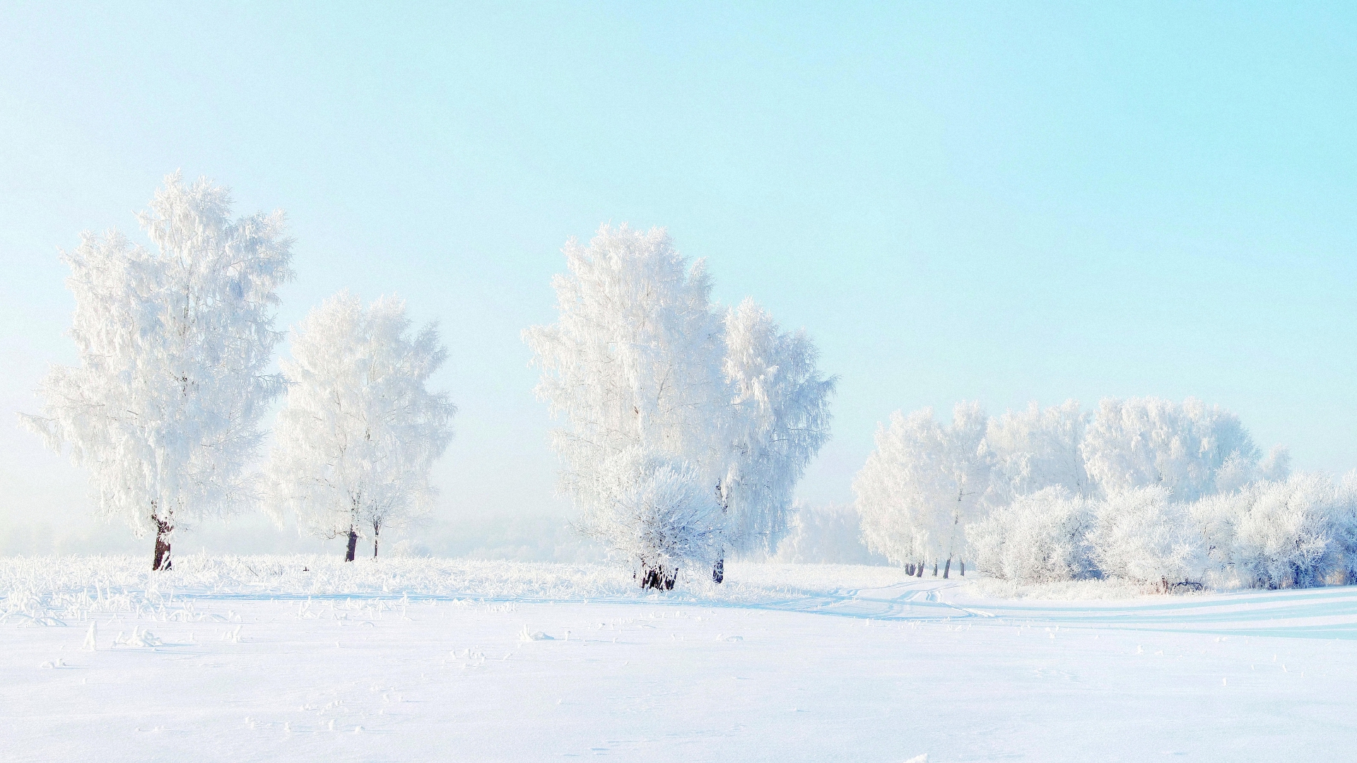 Description: A snowy landscape with trees and a blue sky in the background and a few people walking in the snow.