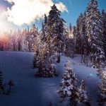 Description: A snowy landscape with trees and a sky background with clouds and sun beams in the distance.