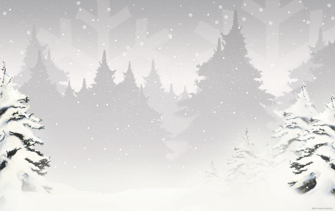 Description: A snowy landscape with trees and snow flakes on it's sides and a white background with a gray border.