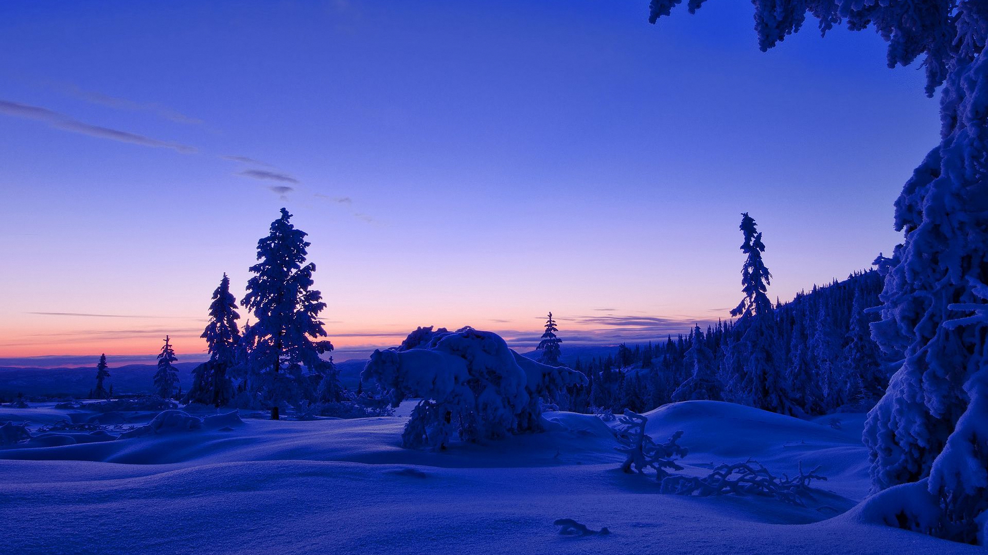 Description: A snowy landscape with trees and a sunset in the background with a blue sky and clouds in the distance.