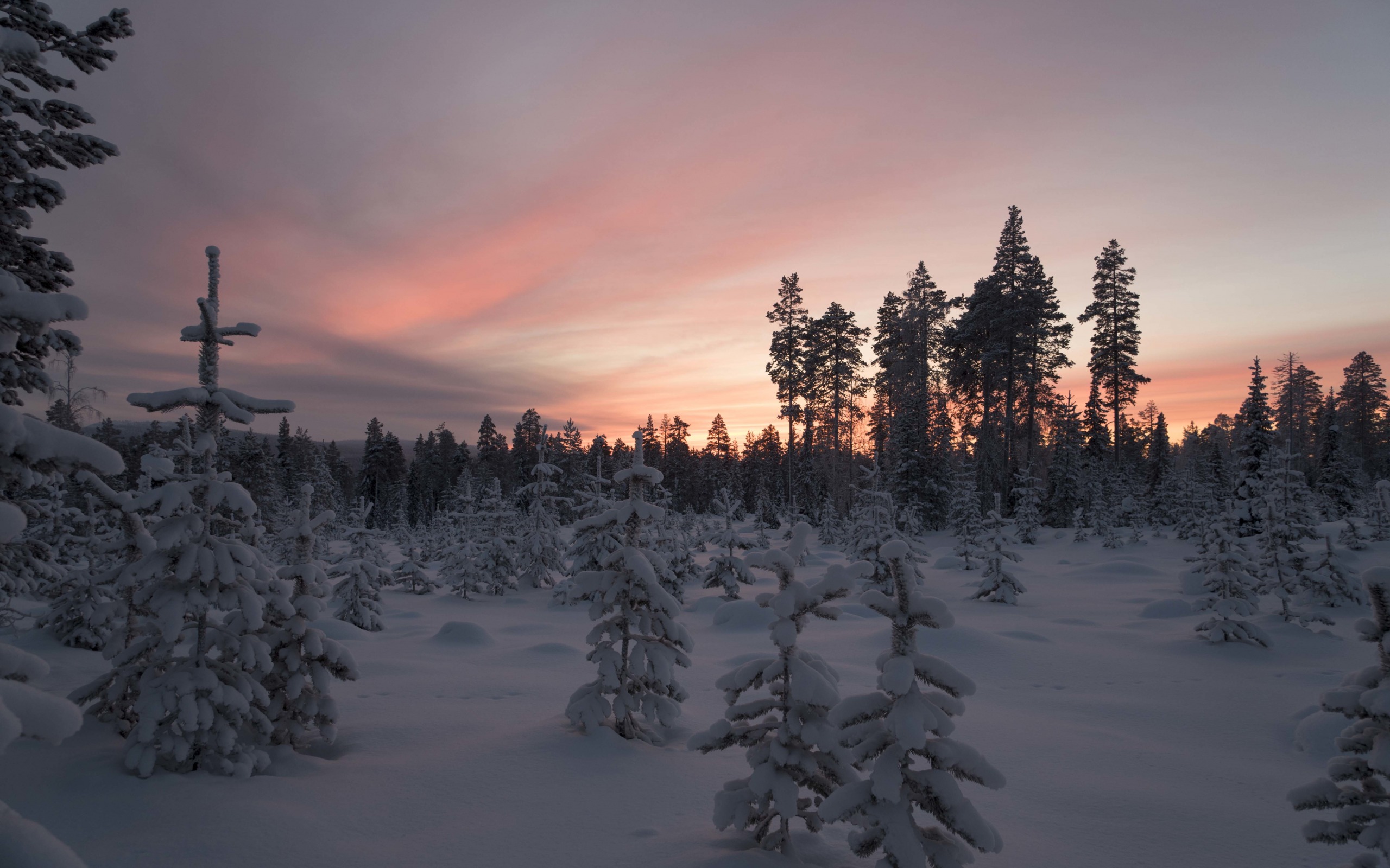 Description: A snowy landscape with trees and a sunset in the background with clouds in the sky and a pink and blue sky.