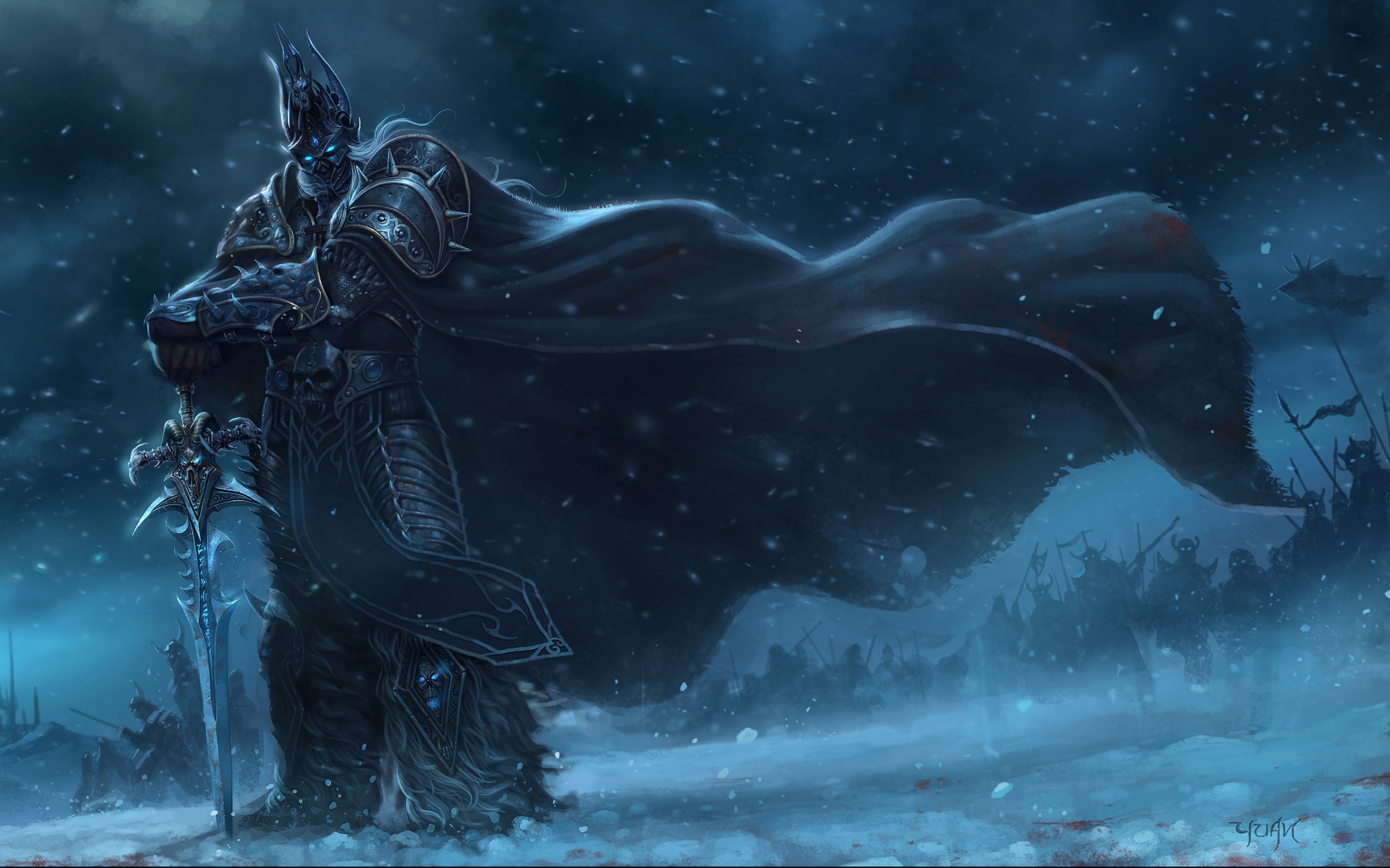Description: A man in a black outfit holding a sword in a snowy landscape with a bear in the background and a sky full of snow.