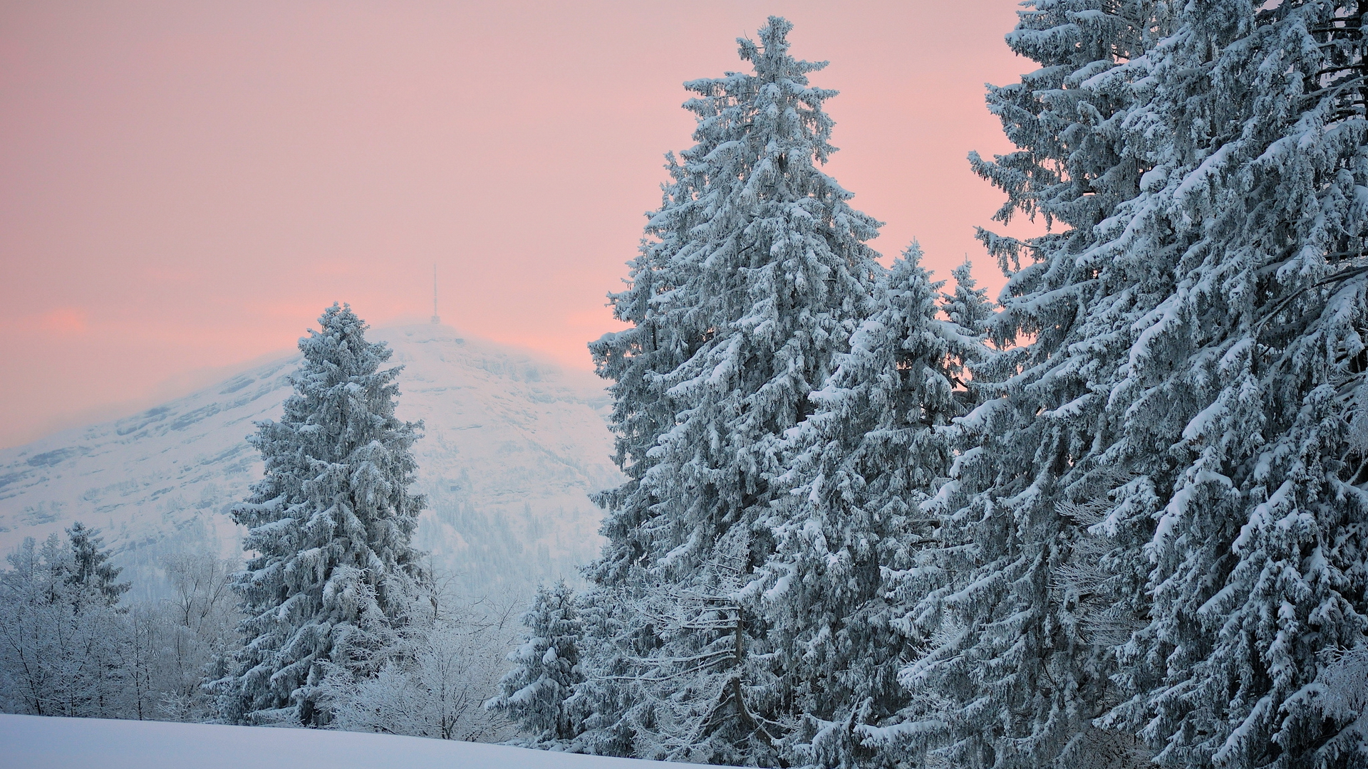 Description: A snowy mountain with trees covered in snow and a pink sky in the background with a pink sky and a pink sky.