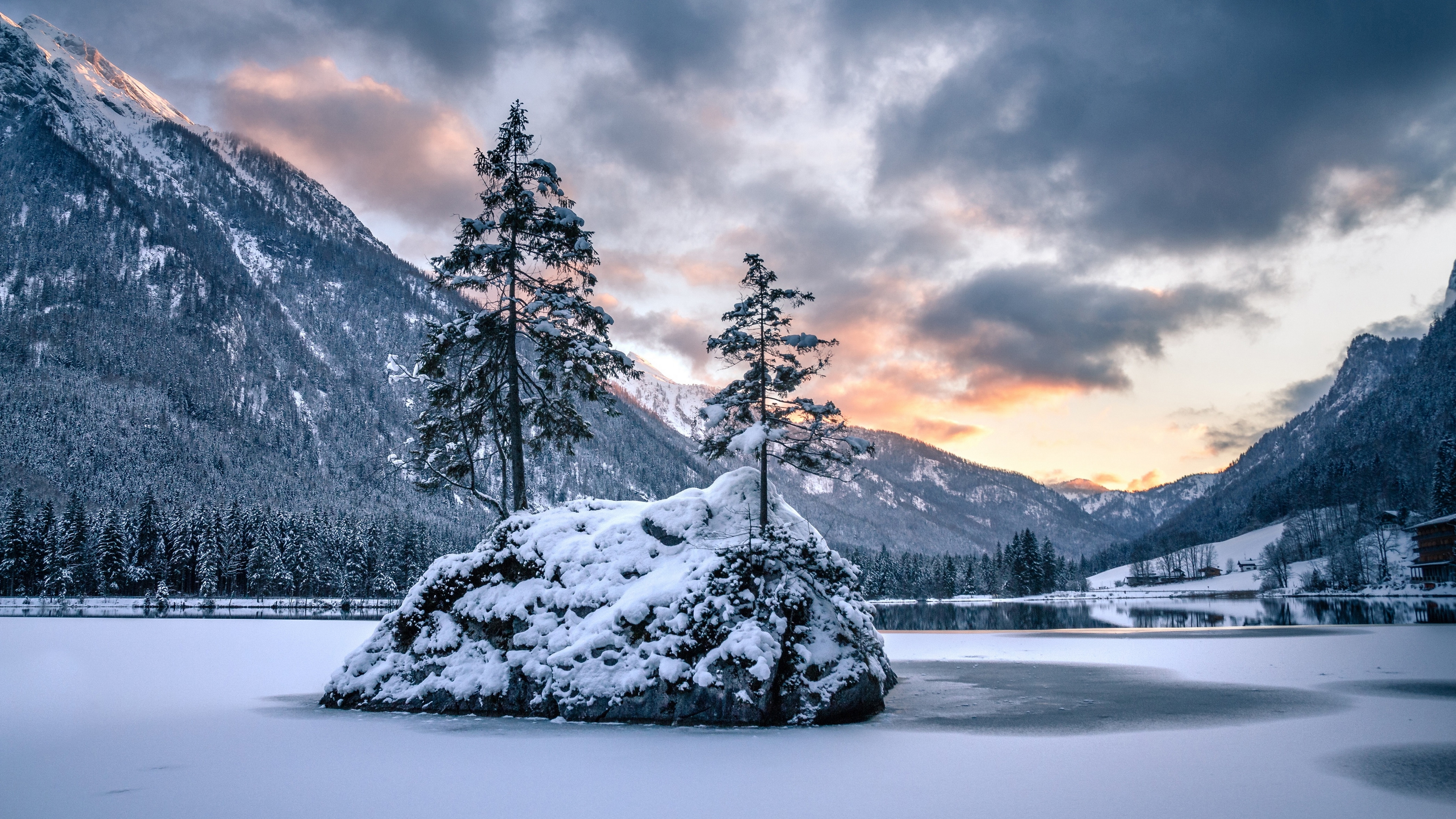 Description: A snow covered rock in a snowy landscape with mountains in the background and a sunset in the distance with clouds in the sky.