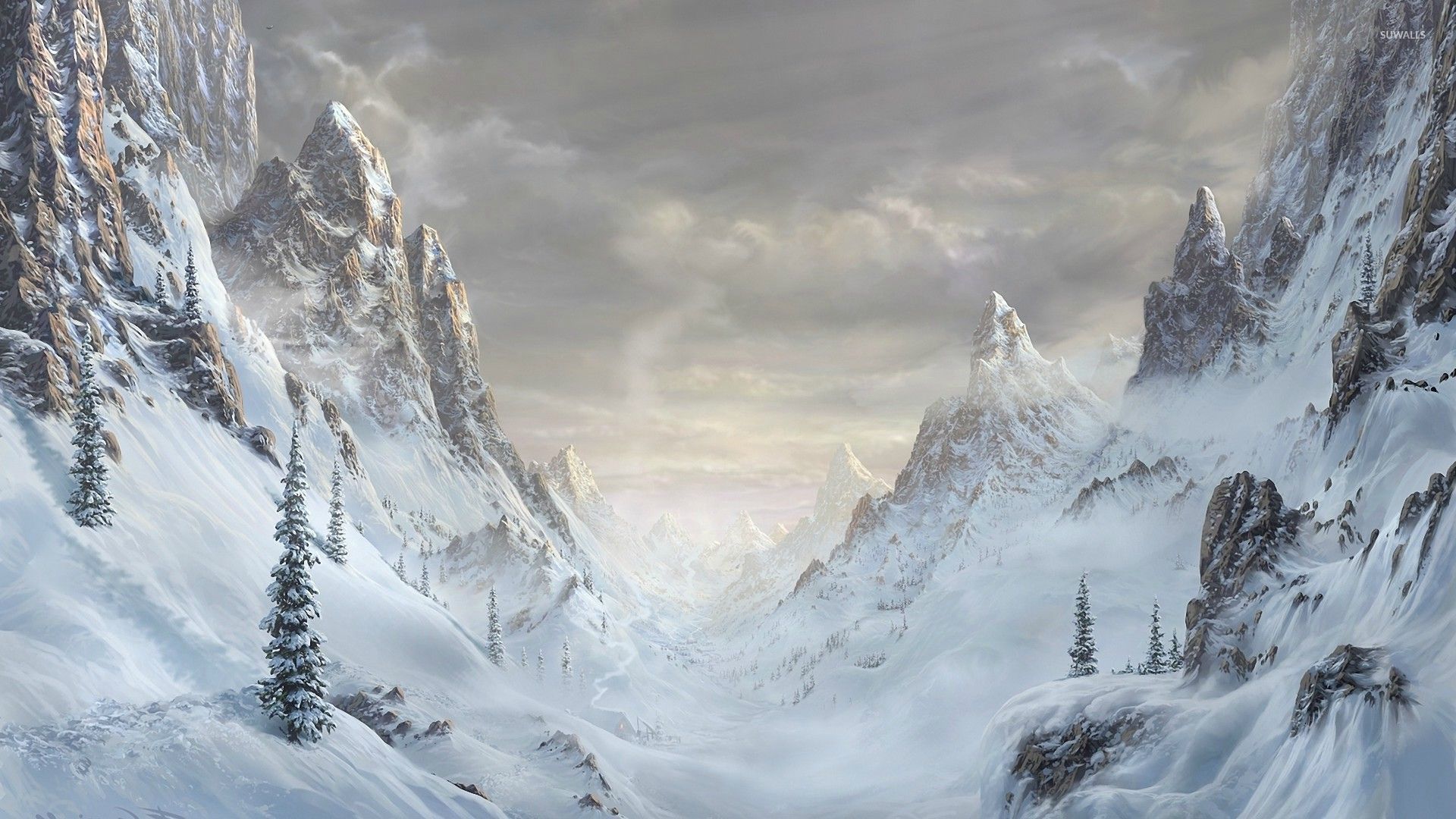 Description: A painting of a snowy mountain landscape with a sky background and clouds above it.