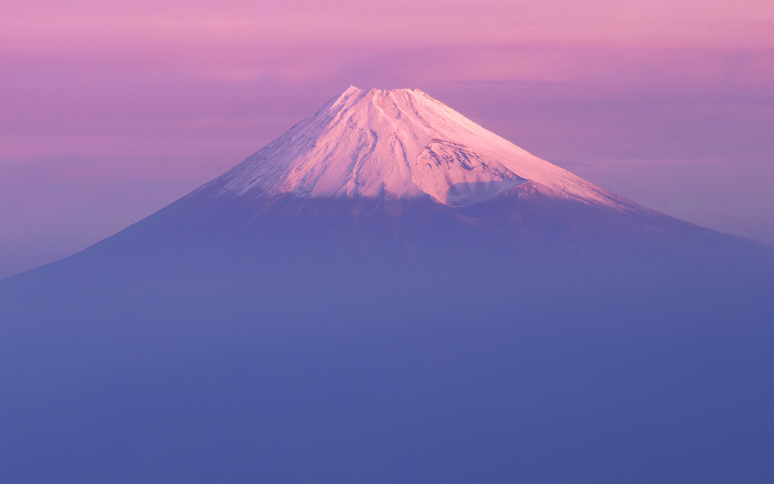 Description: A mountain covered in snow in the distance with a pink sky in the background and a pink cloud in the foreground.