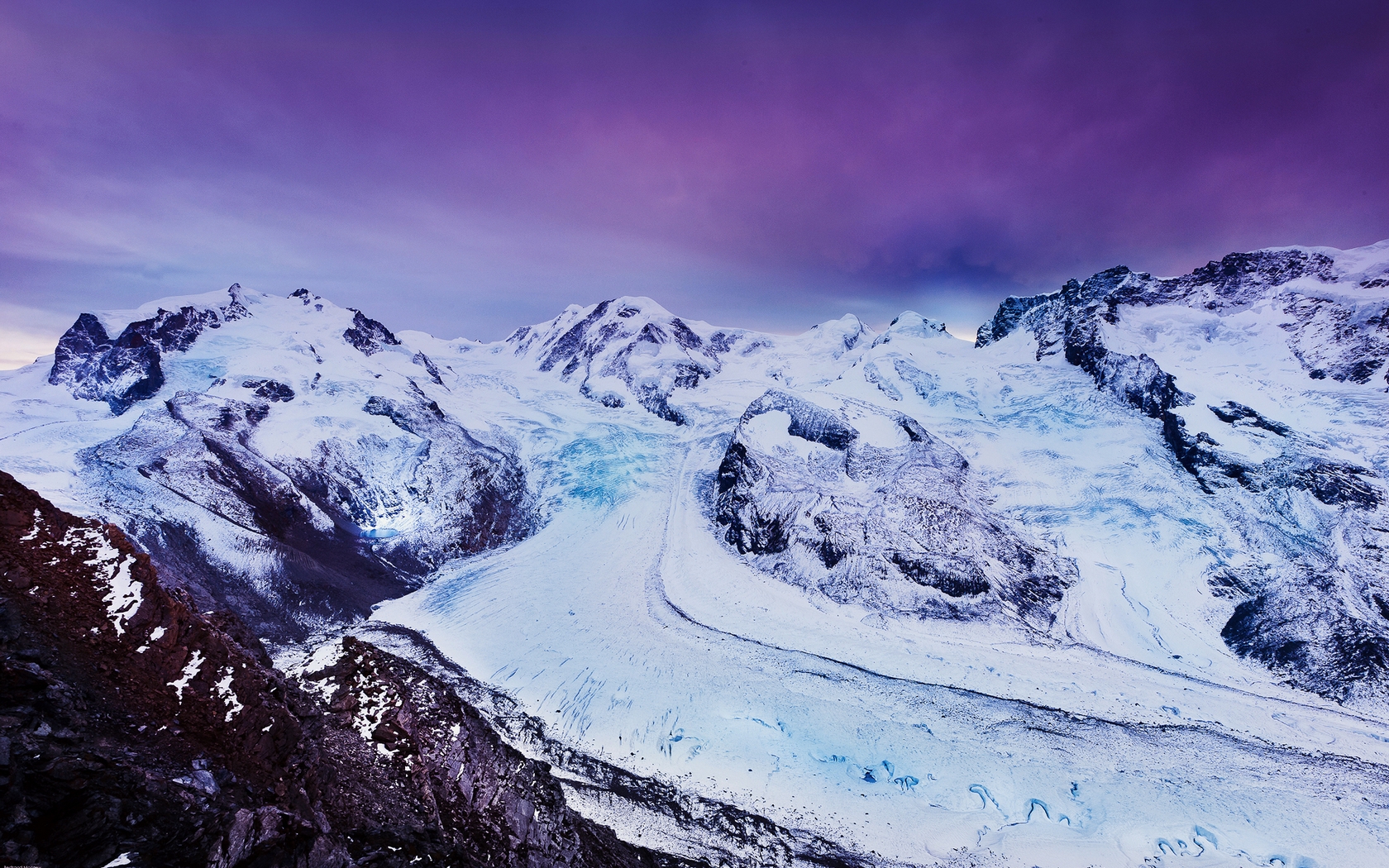 Description: A mountain range covered in snow under a purple sky with clouds above it and a few snow covered mountains.