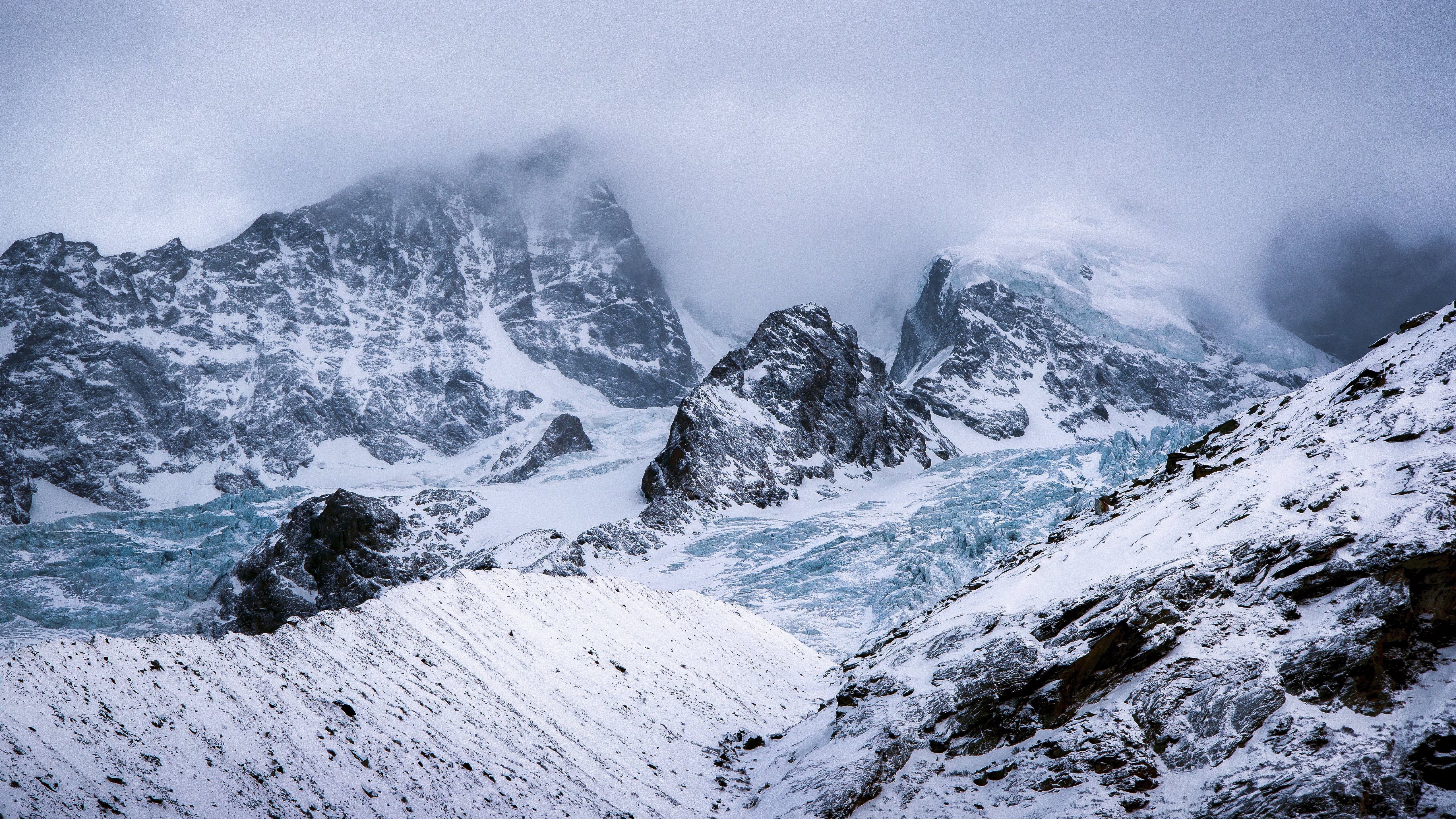Description: A mountain range covered in snow and clouds in the distance is a body of water and a few mountains.