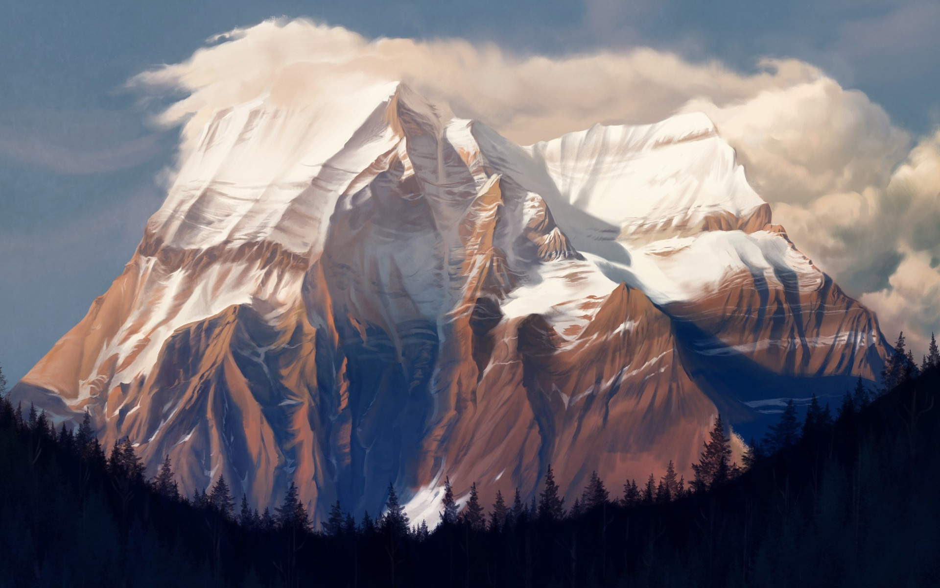 Description: A mountain with a lot of snow on it's top and trees below it.
